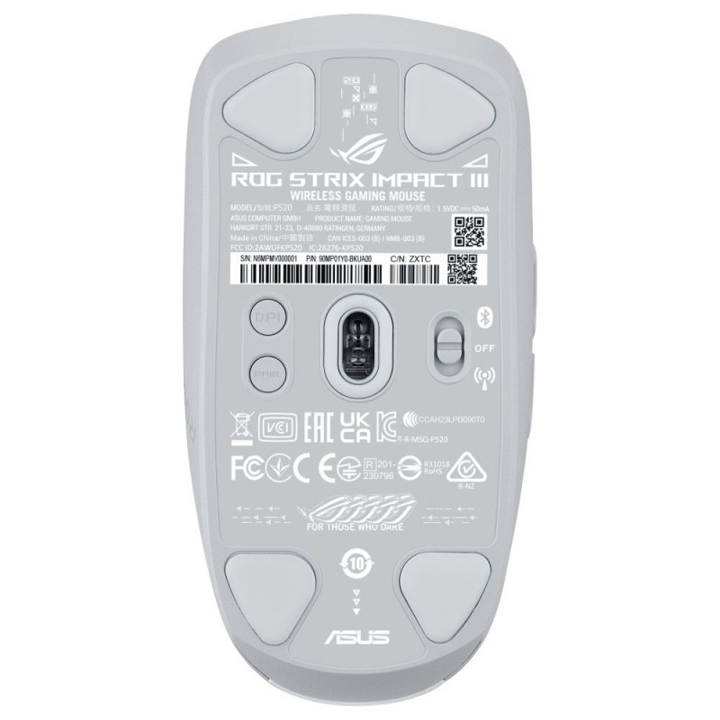 "ASUS ROG Strix Impact III Wireless. Formfaktor: Beidhändig. Bewegungerfassungs Technologie: Optisch, Geräteschnittstelle: RF Wireless + Bluetooth, Bewegung Auflösung: 36000 DPI, Scroll Typ: Rad, Beschleunigung (Max.): 50 G. Energiequelle: Batterien. Produktfarbe: Weiß"