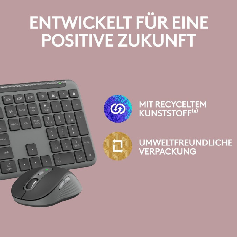 "Logitech Signature Slim Combo MK950. Tastatur Formfaktor: Volle Größe (100%). Tastatur-Stil: Gerade. Übertragungstechnik: Kabellos, Geräteschnittstelle: RF Wireless + Bluetooth, Tastatur-Switch: Scherenschalter, Tastaturaufbau: QWERTZ, Empfohlene Nutzung: Büro. Produktfarbe: Graphit. Maus enthalten"