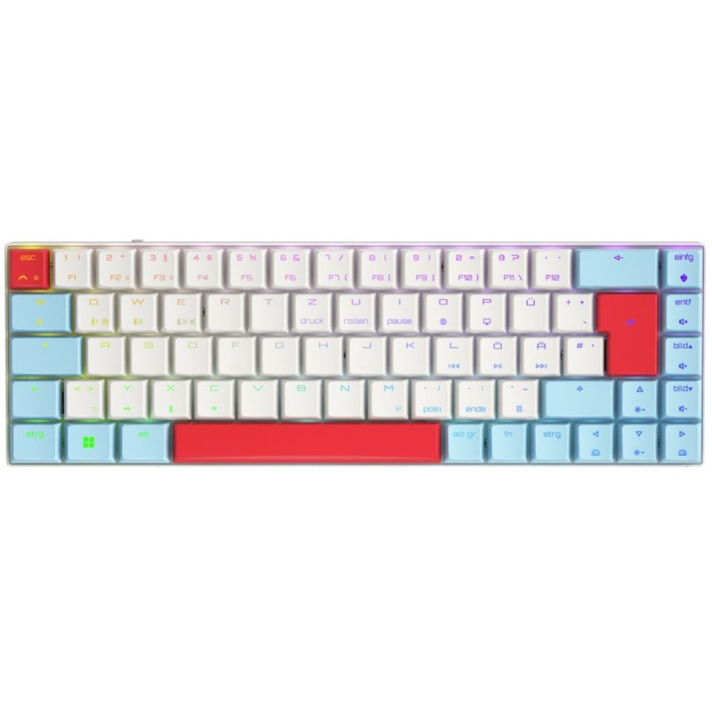 "CHERRY MX-LP 2.1 Compact Wireless. Tastatur Formfaktor: 65%, Übertragungstechnik: Kabellos, Geräteschnittstelle: RF Wireless + Bluetooth, Tastatur-Switch: Mechanischer Switch, Tastaturaufbau: QWERTZ, Tastatur - Tastenanzahl: 69. Typ der Hintergrundbeleuchtung: RGB-LED. Kabellänge: 1,6 m. Empfohlene Nutzung: Gaming. Produktfarbe: Weiß"