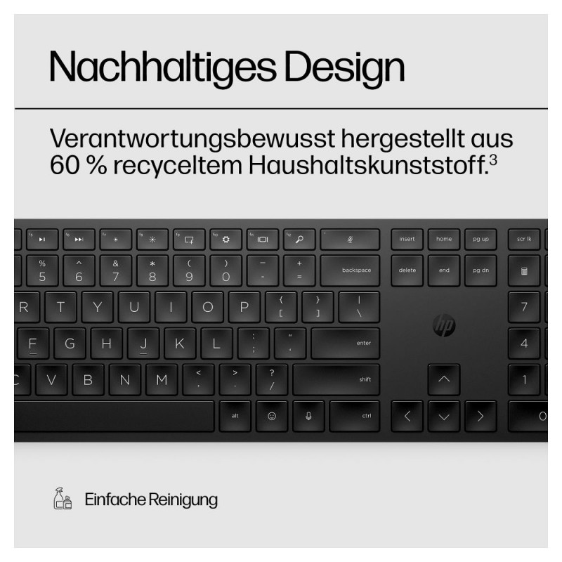 "HP 450 Programmierbare Wireless-Tastatur. Tastatur Formfaktor: Volle Größe (100%), Übertragungstechnik: Verkabelt & Kabellos, Geräteschnittstelle: RF kabellos + USB. Produktfarbe: Schwarz"