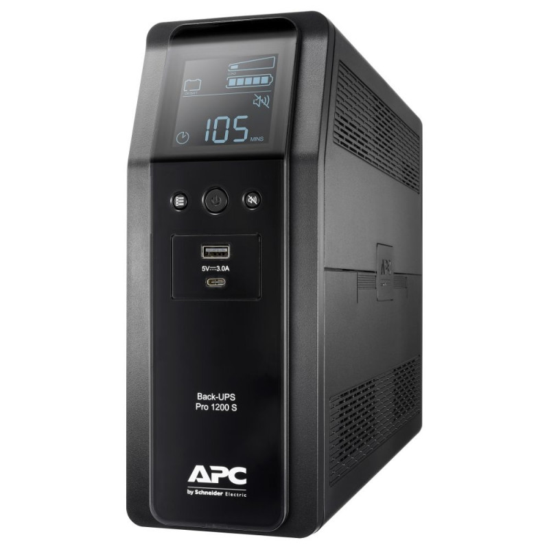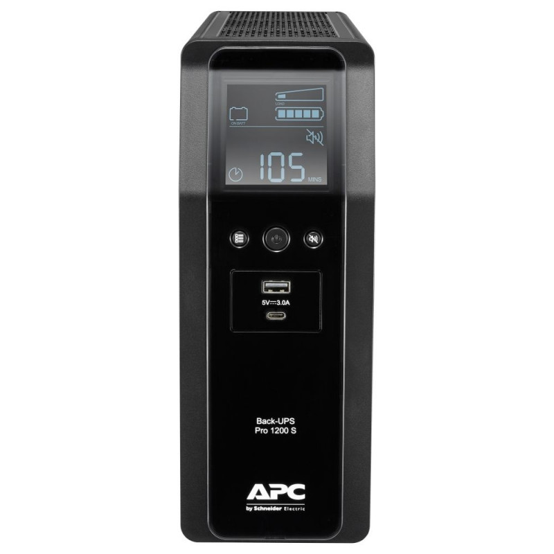 "APC Back-UPS Pro 1200S, 1200 VA, 230 V, Sinuswelle, AVR, LCD, 8 IEC Ausgänge (2 mit Überspannungsschutz). USV-Topologie: Line-Interaktiv, Ausgangskapazität: 1,2 kVA, Ausgangsleistung: 720 W. AC-Steckertypen: C13-Koppler, Anzahl der AC-Ausgänge: 8 AC-Ausgänge. Formfaktor: Tower, Produktfarbe: Schwarz. Nachhaltigkeitszertifikate: Green Premium. Breite: 100 mm, Tiefe: 368 mm, Höhe: 260 mm"