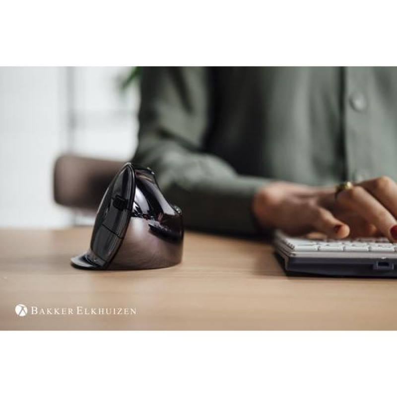 With the Evoluent D vertical mouse you experience ergonomics and comfort at a higher level, and handling is incredibly easy and intuitive.<br><br><b>The latest wireless Evoluent mouse with so many great features!</b><br>A patented ergonomic shape, programmable buttons, extra wide lip along the bottom edge, easy to reach thumb buttons, the USB receiver can be stored behind a magnetic battery cover, a direct reachable pointer speed button, three different mouse sizes available, functions like ‘Smart Scrolling’ and ‘Eye Comfort Control’, all those great features are combined in the Evoluent D - we give you even more reasons to get to know and love the Evoluent D.<br><br><b>Perfect shape, even the buttons.</b><br>The Evoluent D has grooved buttons, so your fingertips rest in a shallow groove on the buttons. This innovation secures the mouse in your hands and makes moving it much more precise. The easy-to-reach thumb buttons are smartly placed and are both within easy reach at the top and bottom of a contoured thumb rest. All those details will lead to an efficient work.<br><br><b>Your mouse. Your mouse button assignment.</b><br>With the free download version of the Evoluent Mouse Manager software , you can easily configure the five buttons of your Evoluent D. With the individual setting of your mouse buttons, you can work as conveniently as possible.<br><br><b>Three sizes, both in wireless and wired.</b><br>The Evoluent D is available in three different sizes: small, medium, and large. You can choose if you would like to have a wired or wireless version. The combination of the correct mouse size for your hand and the ergonomic shape, ensure a relaxed grip and a short time to get used to it.<br><br><b>Adjust the DPI conveniently. You determine the pointer speed.</b><br>The adjustable pointer speed button of the Evoluent D is easy to reach. It is placed behind the wheel which enables quick changing of the pointer speed to suit different tasks: select higher speed (higher DPI) to make the pointer move faster for general use; select lower speed (lower DPI) to make the pointer move slower and more precisely for drawing, photo editing, etc. The favourable thing is, that four lights show the different pointer speeds from slow to fast.<br><br><b>Plug-and-play.</b><br>The Evoluent D can be added to the computer without having to do a manual configuration. Just put the USB cable of the wired version or the USB receiver of the wireless version in your computer and start working. The USB receiver of the wireless versions of the Evoluent D can be stored behind a magnetic battery cover, so you will never lose it. The laser sensor ensures reliable tracking on most surfaces.<br><br><b>Cool features.</b><br>The Evoluent D has useful features for a more efficiency at work. With the ‘Excel Horizontal Scroll’ you can scroll horizontally in Microsoft® Excel® by pressing a thumb button and rolling the wheel. The function ‘Smart Scrolling’ enables dramatically varies sensitivity per notch in response to the speed you roll the wheel, from slow-and-precise all the way to hyper speed for blazing through long pages. With ‘Eye Comfort Control’ you can quickly lower your screen’s brightness to help reduce eye strain by simply rolling the mouse wheel. Easily change the brightness of the screen as your ambient light level changes.BakkerElkhuizen Evoluent D Small Wireless. Form factor: Right-hand, Vertical design. Movement detection technology: Laser, Device interface: RF Wireless, Movement resolution: 3200 DPI, Buttons type: Pressed buttons, Buttons quantity: 6, Scroll type: Wheel. Power source: Batteries. Product colour: Black