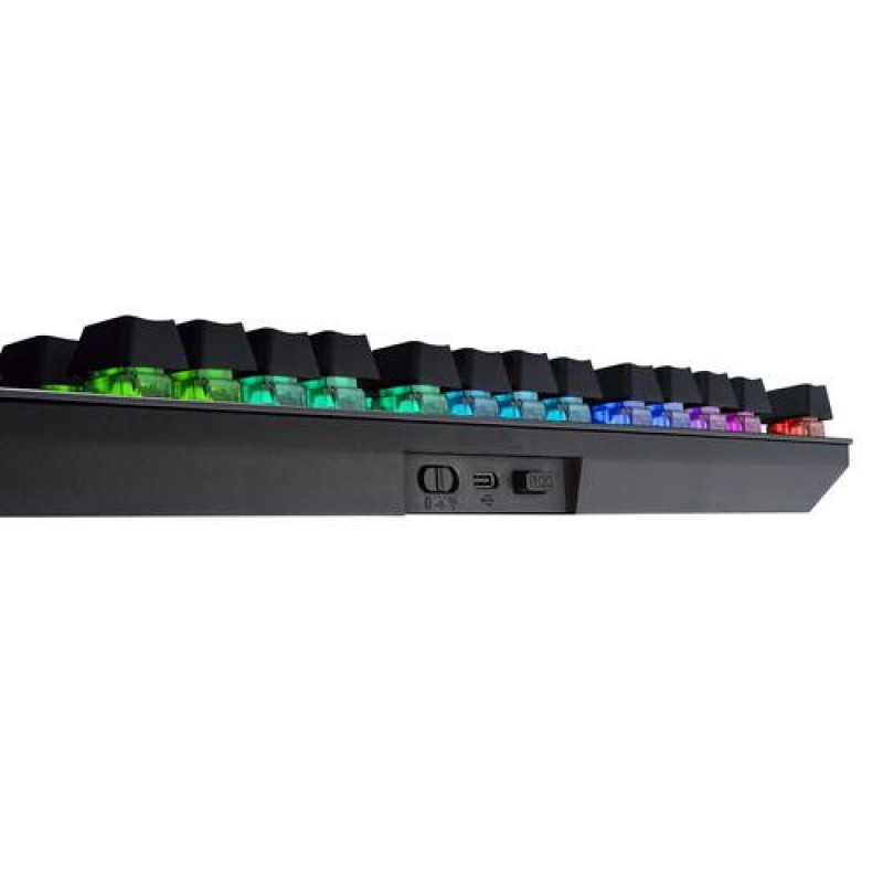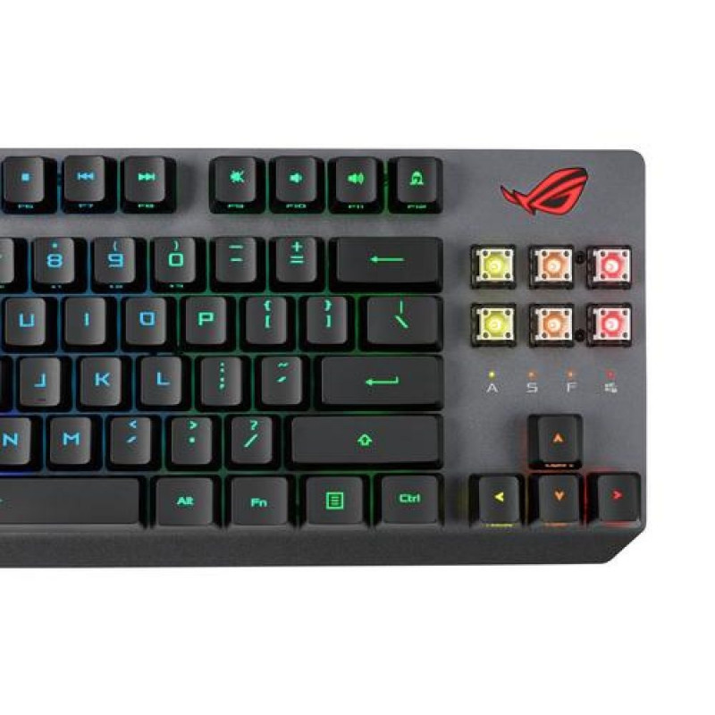 <b>Victory with lightspeed response and connectivity</b><br>Rise above opponents with the ultimate FPS gaming keyboard: ROG Strix Scope RX TKL Wireless Deluxe. This compact tenkeyless keyboard includes an extended Ctrl key and offers unprecedented versatility with tri-mode connectivity via wired, 2.4 GHz RF wireless and Bluetooth® connection. Exclusive ROG RX Optical Mechanical Switches provide a 100-million-keystroke lifespan and consistent, instantaneous keystrokes.<br><br><b>Versatile Tri-Mode Connectivity</b><br>The 2.4 GHz RF mode offers up to 76 hours of stable, uninterrupted near-zero-latency gameplay, even with RGB lighting on. Alternatively, you can use Bluetooth mode to connect to up to three devices at the same time, or charge and play simultaneously in wired USB mode.<br><br><b>ROG RX Optical Mechanical Switches</b><br>ROG RX Red and RX Blue optical mechanical switches offer consistent, wobble-free keystrokes with a superfast 1 ms response and 100-million-keystroke lifespan. These premium switches have a hollow-square stem design and they feature embedded RGB LEDs providing all-round per-key lighting.<br><br><b>TKL Form Factor for FPS Players</b><br>The ROG Strix Scope RX TKL Wireless Deluxe has a compact design that leaves more space on your desk for broader mouse movements – so it’s perfect for snipers using low sensitivity settings. It’s also easy to stow and carry in a backpack, so you can dominate at home or at LAN tournaments.<br><br><b>Strix Scope Series Essentials</b><br>The ROG Strix Scope RX TKL Wireless Deluxe includes the mainstay features of the Strix Scope series.<br><br><b>PBT Doubleshot Keycaps</b><br>ROG PBT doubleshot keycaps provide a unique and premium feel. And they also offer long-lasting durability.<br><br>Made using a precise doubleshot molding process, the translucent keycaps feature a seamless ROG script to provide consistent lighting and a look that’s unmistakably ROG.<br>* Keycap material may vary by region. Keycap puller not included.<br><br><b>MAGNETIC & ERGONOMIC WRIST REST</b><br>The ROG Strix Scope RX TKL Wireless Deluxe comes with an ergonomic leatherette wrist rest that can be attached to the keyboard to ensure comfort during marathon gaming sessions.<br><br><b>WIRELESS AURA SYNC RGB LIGHTING</b><br>Vibrant per-key backlighting illuminates the ROG Strix Scope RX TKL Wireless Deluxe from top to bottom and from edge to edge. Powered by Aura Sync, the entire color spectrum and a range of dynamic lighting effects are at your command to create a keyboard that’s uniquely yours. The lighting is easily synced with the extensive Aura ecosystem to create a gaming environment that truly shines.<br>* Wireless Aura Sync only available in 2.4 GHz RF mode.<br><br><b>ARMOURY CRATE</b><br>The Armoury Crate app helps you manage every aspect of your rig – from initial setup to RGB illumination. Keep your product up-to-date with the latest updates, drivers or manuals. You can also receive special ASUS and ROG offers, plus access to the forums to instantly connect with your gaming peers.<br><br><b>ONBOARD MEMORY</b><br>Save up to six profiles, including up to five custom schemes, and use them anytime, anywhere.<br><br><b>100% ANTI-GHOSTING & N-KEY ROLLOVER</b><br>Every keystroke is registered accurately without miss no matter how fast you play.<br><br><b>ON-THE-FLY MACRO RECORDINGS</b><br>Record macros on the fly and map them to fully programmable keys.<br><br><b>WINDOWS LOCK KEY</b><br>Disable the Windows key with a single press for undisturbed gaming.<br><br><b>WIRELESS DONGLE EXTENDER</b><br>Provides a strong and stable wireless connection.<br><br><b>BATTERY INDICATOR</b><br>Check ROG logo backlight (green, blue, red) for battery level.ASUS ROG Strix Scope RX TKL Wireless Deluxe. Keyboard form factor: 80%. Keyboard style: Straight. Connectivity technology: Wired & Wireless, Device interface: USB + RF Wireless + Bluetooth, Keyboard key switch: Mechanical, Keyboard layout: AZERTY. Backlight type: RGB LED, Wrist rest. Recommended usage: Gaming. Product colour: Black