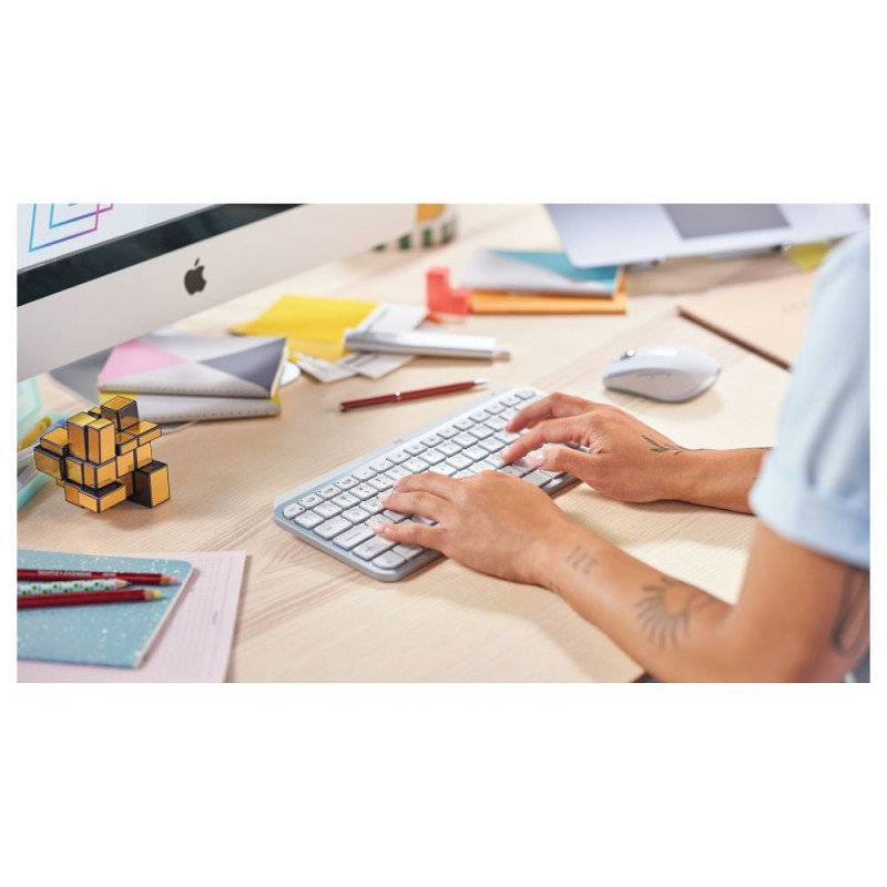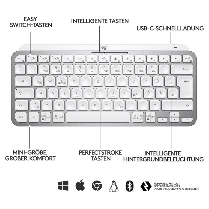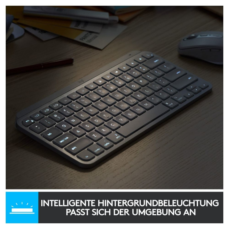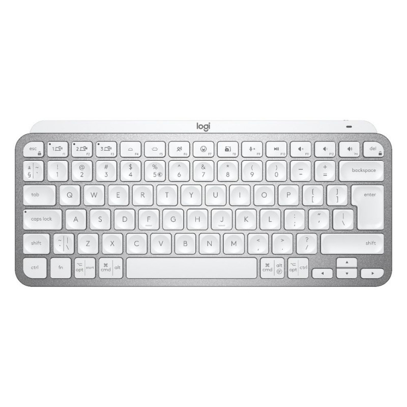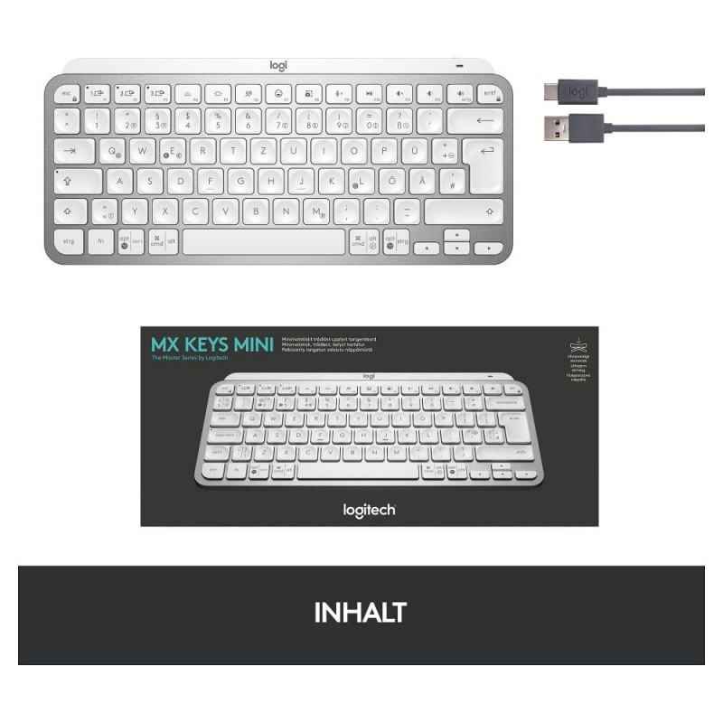 "Logitech Master MX Keys Mini. Tastatur Formfaktor: Mini. Tastatur-Stil: Gerade. Übertragungstechnik: Kabellos, Geräteschnittstelle: RF Wireless + Bluetooth, Tastaturaufbau: QWERTY. Typ der Hintergrundbeleuchtung: LED. Empfohlene Nutzung: Büro. Produktfarbe: Grau"