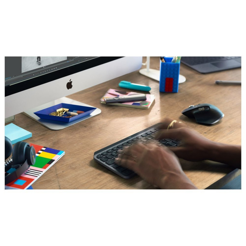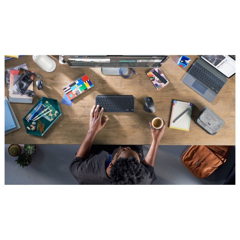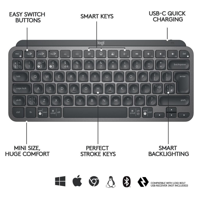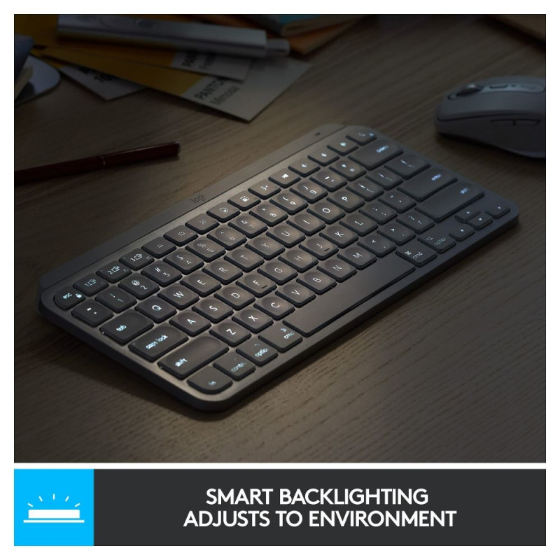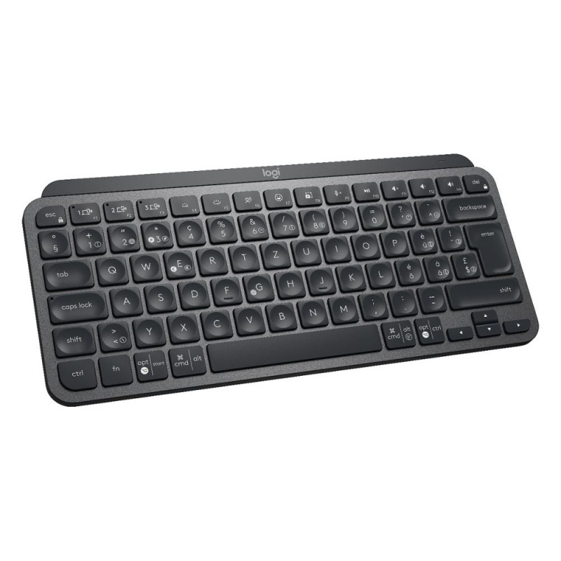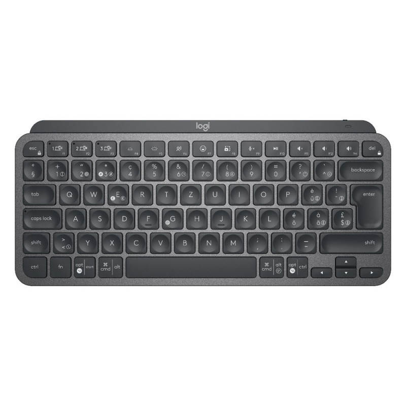 "Logitech MX Keys Mini. Tastatur Formfaktor: Mini. Tastatur-Stil: Gerade. Übertragungstechnik: Kabellos, Geräteschnittstelle: RF Wireless + Bluetooth, Tastaturaufbau: QWERTZ. Typ der Hintergrundbeleuchtung: LED. Empfohlene Nutzung: Büro. Produktfarbe: Graphit"
