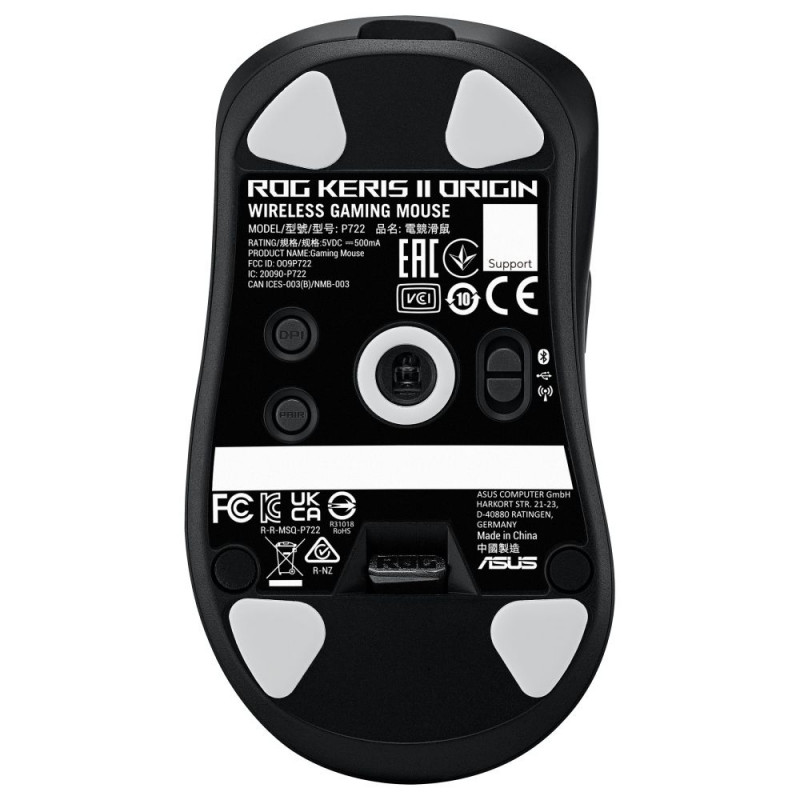 "ASUS ROG Keris II Origin BLK. Formfaktor: rechts. Bewegungerfassungs Technologie: Optisch, Geräteschnittstelle: RF Wireless + Bluetooth + USB Type-A, Bewegung Auflösung: 42000 DPI, Tastentyp: Gedrückte Tasten, Knopfanzahl: 6, Scroll Typ: Rad. Farben der Beleuchtung: Multi. Energiequelle: Batterien / Kabel. Produktfarbe: Schwarz"