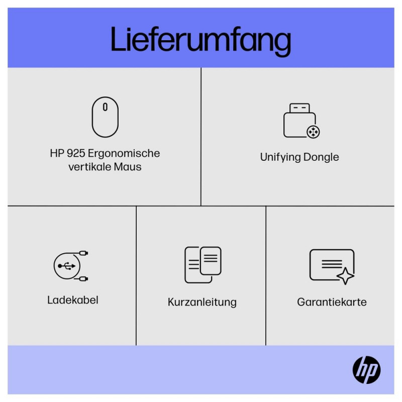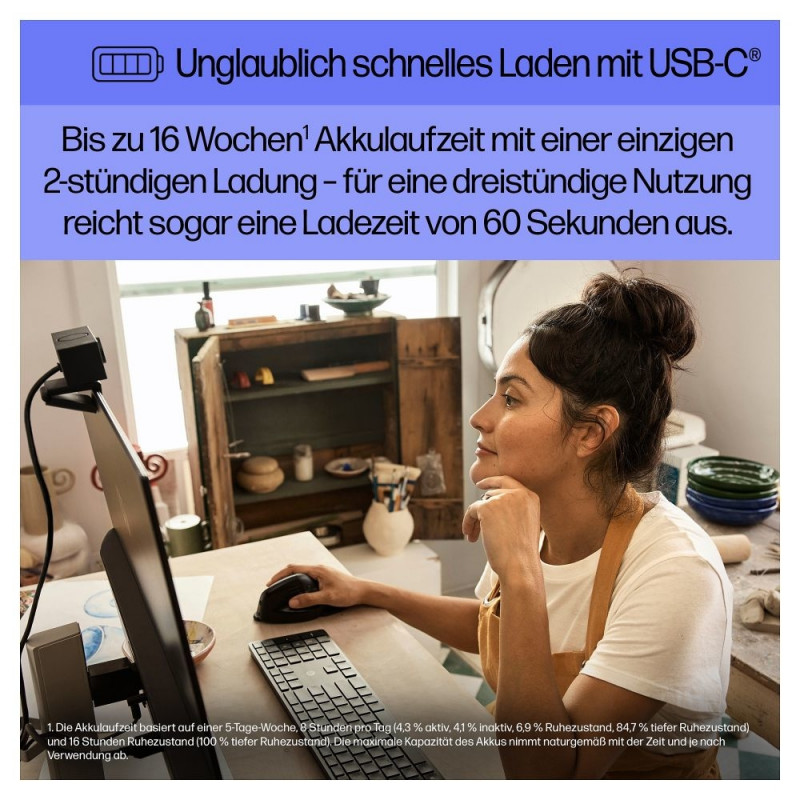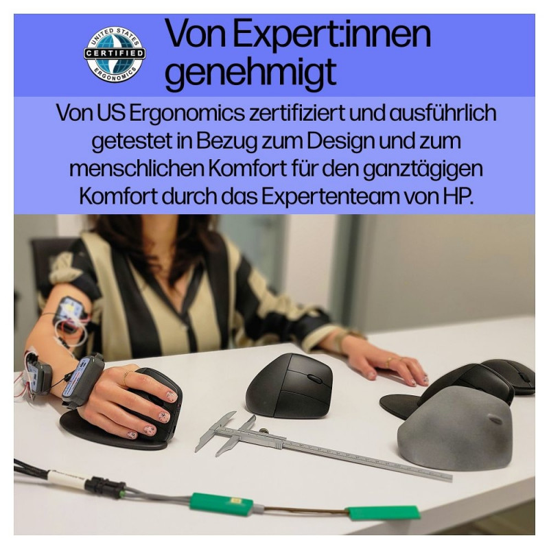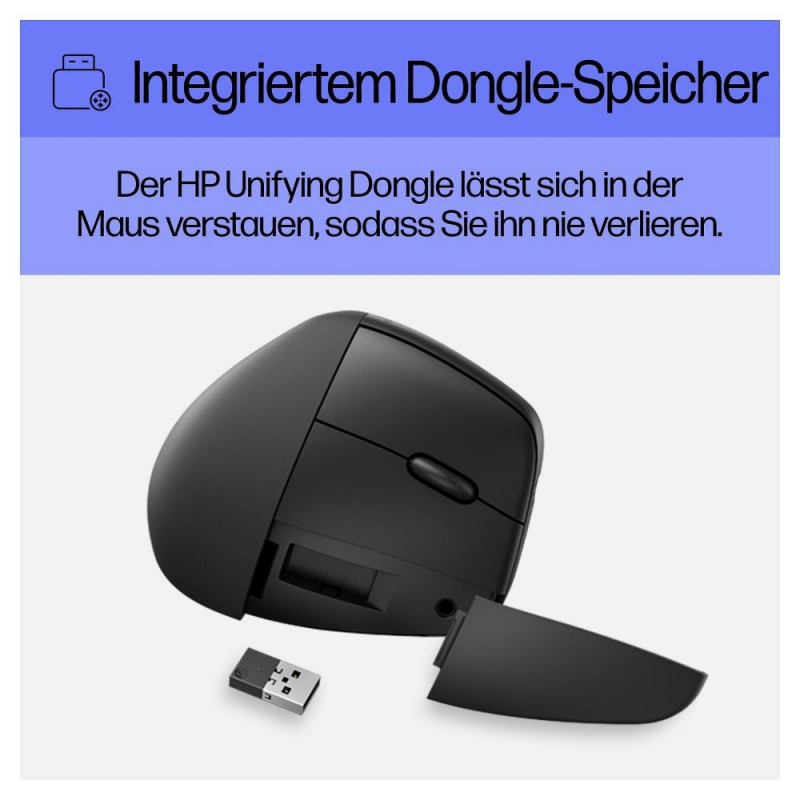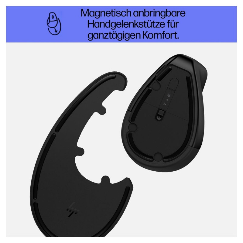 "HP 920 Ergonomische Wireless-Maus. Formfaktor: rechts, Vertikale Ausführung. Geräteschnittstelle: Bluetooth + USB Type-A, Bewegung Auflösung: 4000 DPI, Knopfanzahl: 5, Scroll Typ: Rad. Energiequelle: Batterien. Produktfarbe: Schwarz"