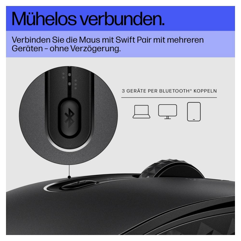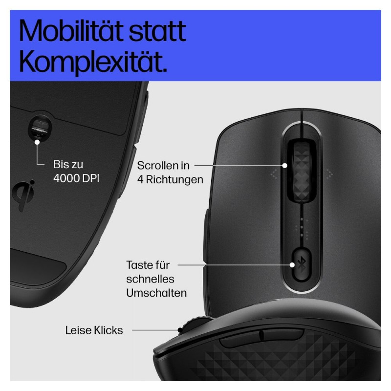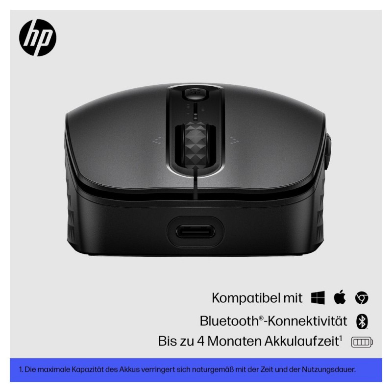 "HP 690 Wiederaufladbare Wireless-Maus. Formfaktor: Beidhändig. Geräteschnittstelle: Bluetooth, Bewegung Auflösung: 4000 DPI, Tastentyp: Gedrückte Tasten, Knopfanzahl: 7, Scroll Typ: Rad. Energiequelle: Batterien. Produktfarbe: Schwarz"