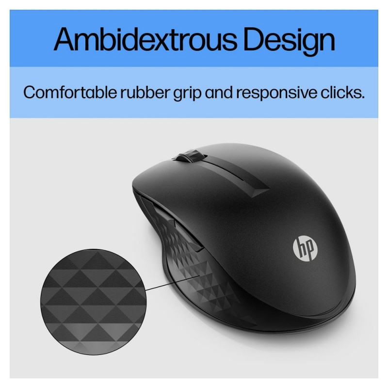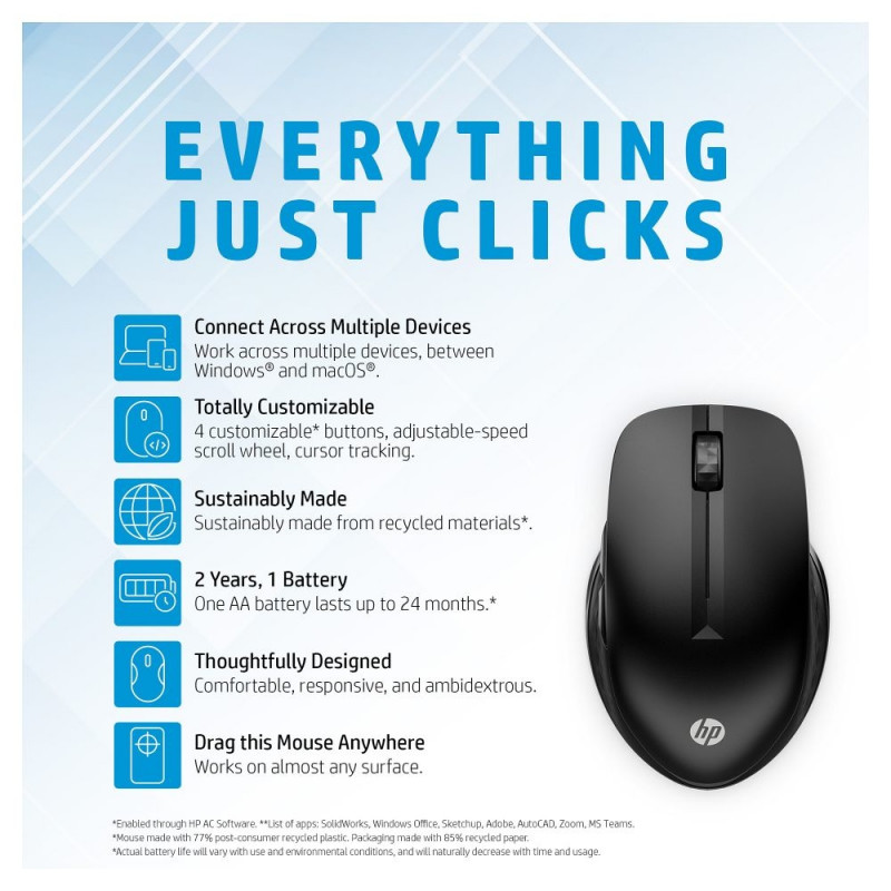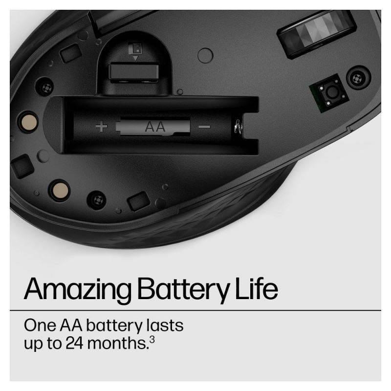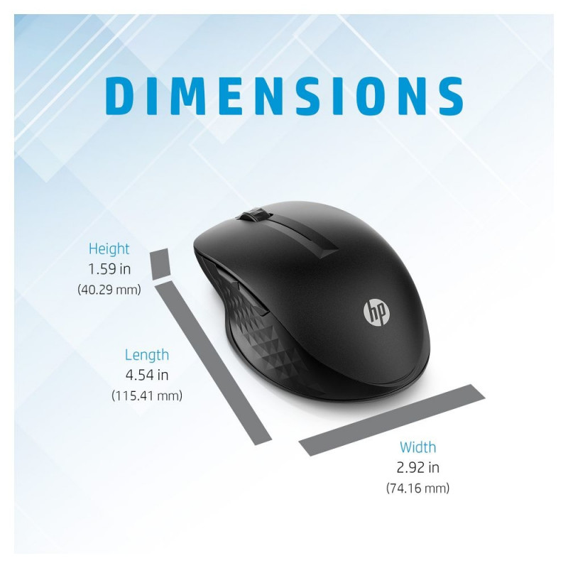 "HP 430 Wireless-Maus für mehrere Geräte. Formfaktor: Beidhändig. Bewegungerfassungs Technologie: Optisch, Geräteschnittstelle: RF Wireless + Bluetooth, Bewegung Auflösung: 1200 DPI, Tastentyp: Gedrückte Tasten, Knopfanzahl: 5, Scroll Typ: Rad. Energiequelle: Batterien. Produktfarbe: Schwarz"