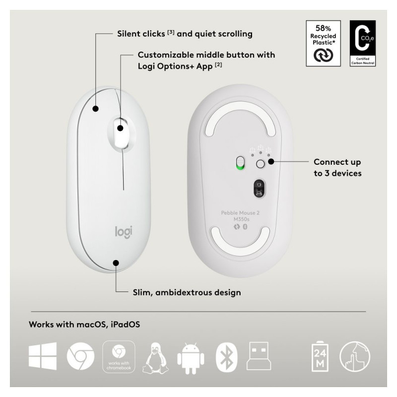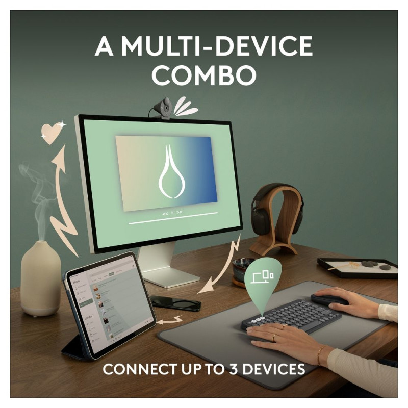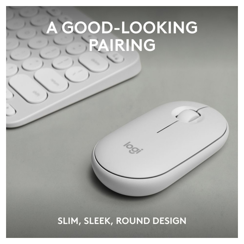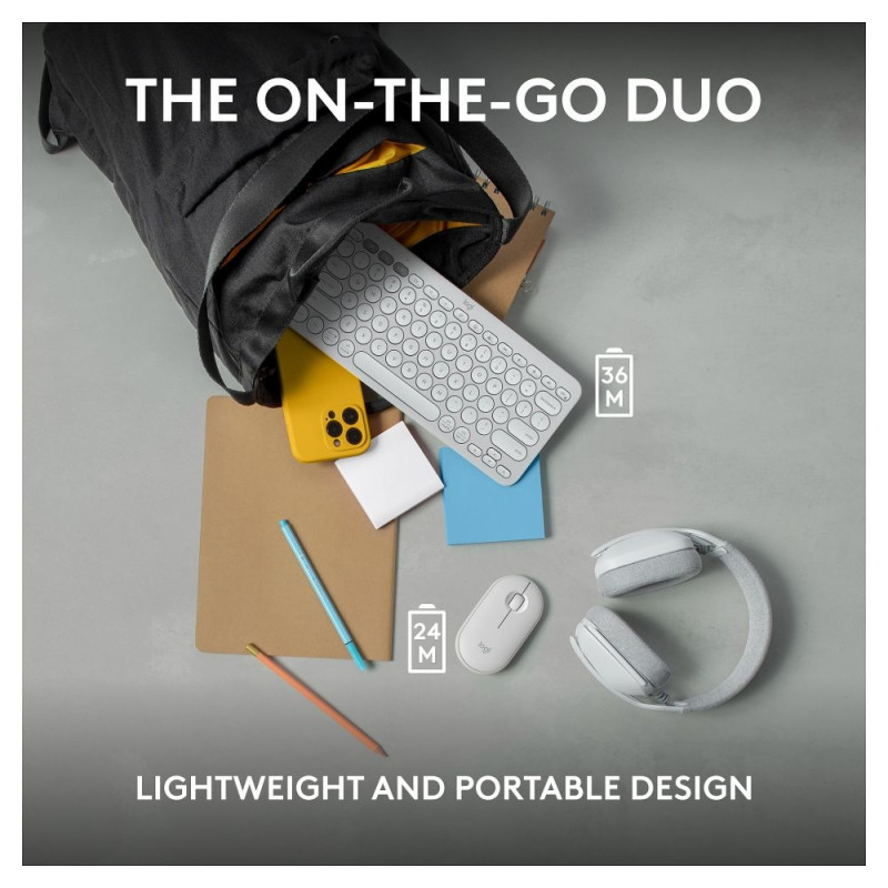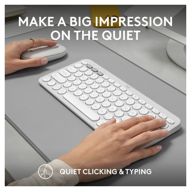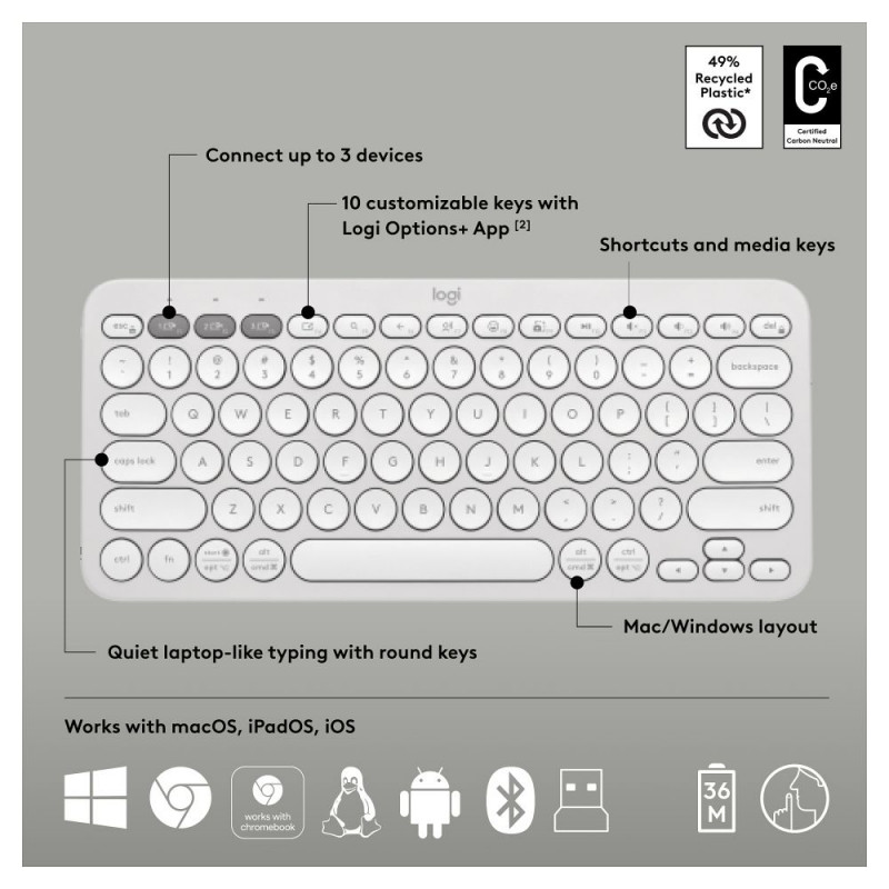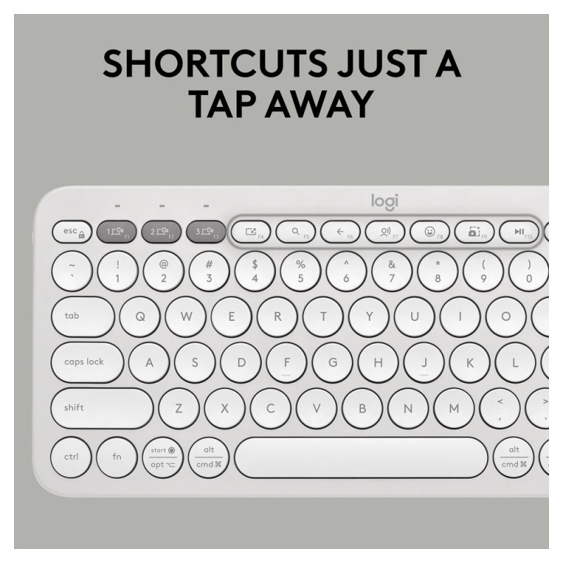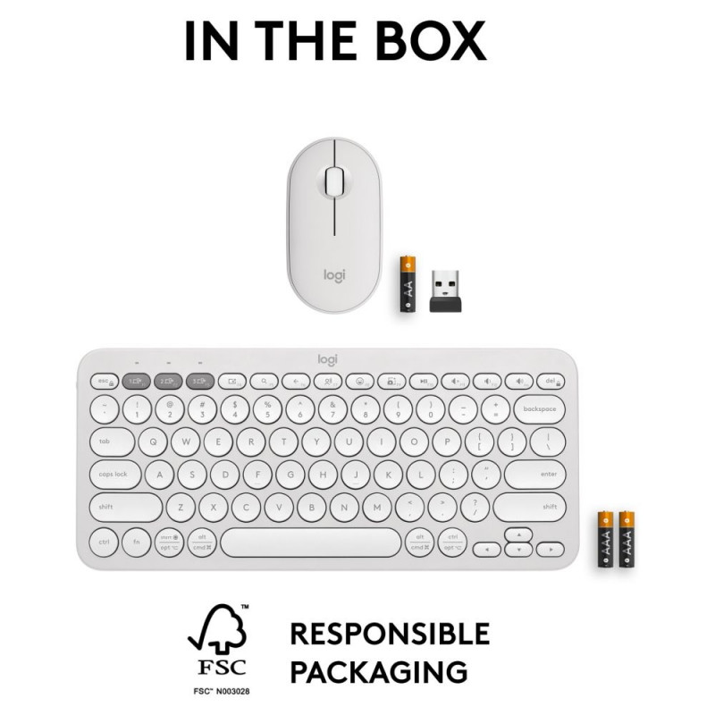 "Logitech 920-012240. Tastatur Formfaktor: Mini. Tastatur-Stil: Gerade. Übertragungstechnik: Kabellos, Geräteschnittstelle: RF Wireless + Bluetooth, Tastatur-Switch: Scherenschalter, Tastaturaufbau: QWERTY, Empfohlene Nutzung: Universal. Produktfarbe: Weiß. Maus enthalten"