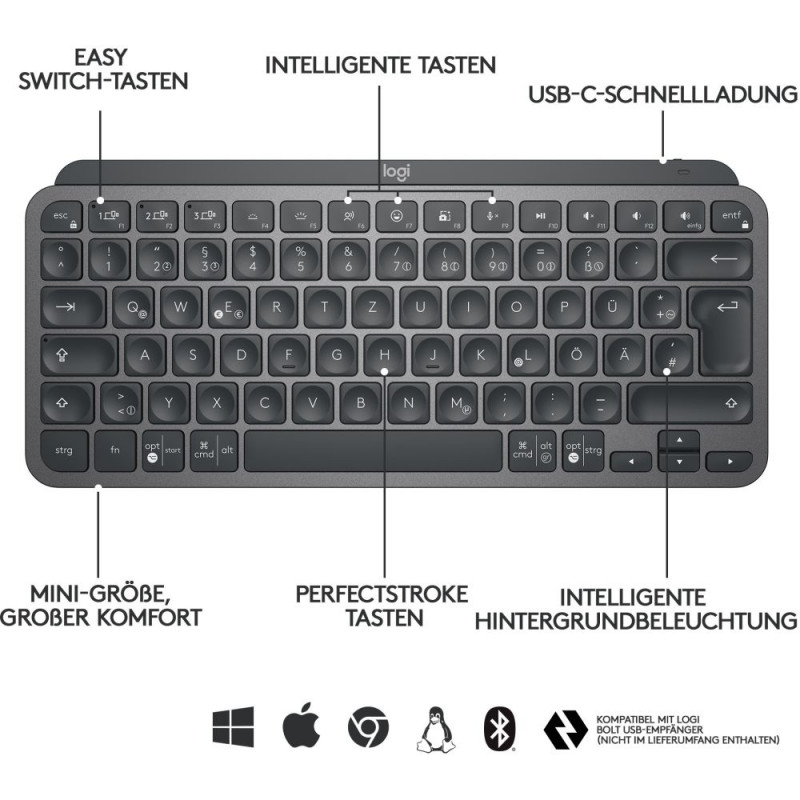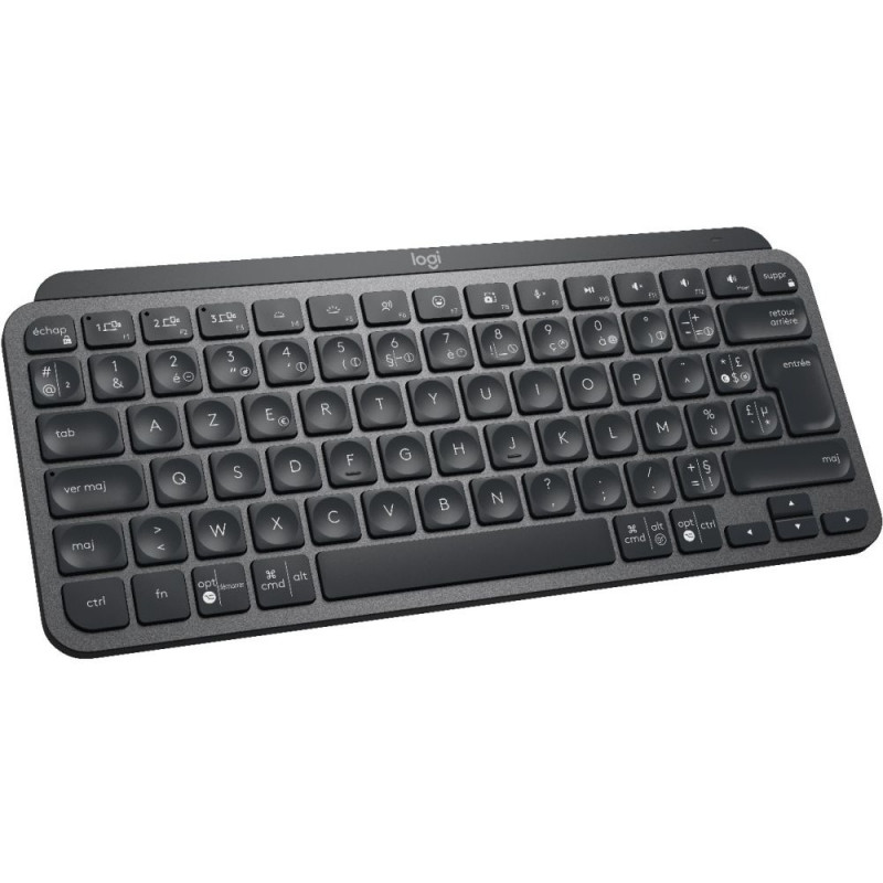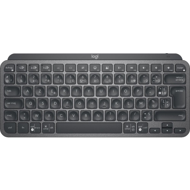 "Logitech Master MX Keys Mini. Tastatur Formfaktor: Mini. Tastatur-Stil: Gerade. Übertragungstechnik: Kabellos, Geräteschnittstelle: RF Wireless + Bluetooth, Tastaturaufbau: AZERTY. Typ der Hintergrundbeleuchtung: LED. Empfohlene Nutzung: Büro. Produktfarbe: Graphit"