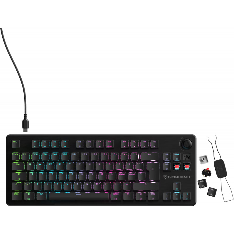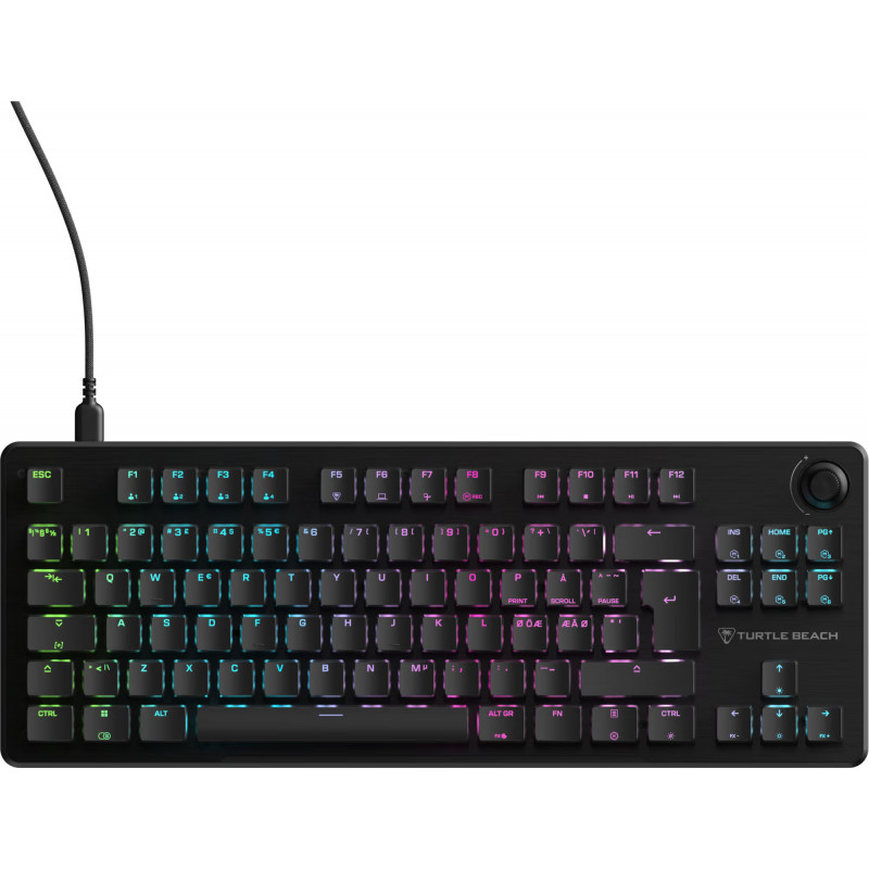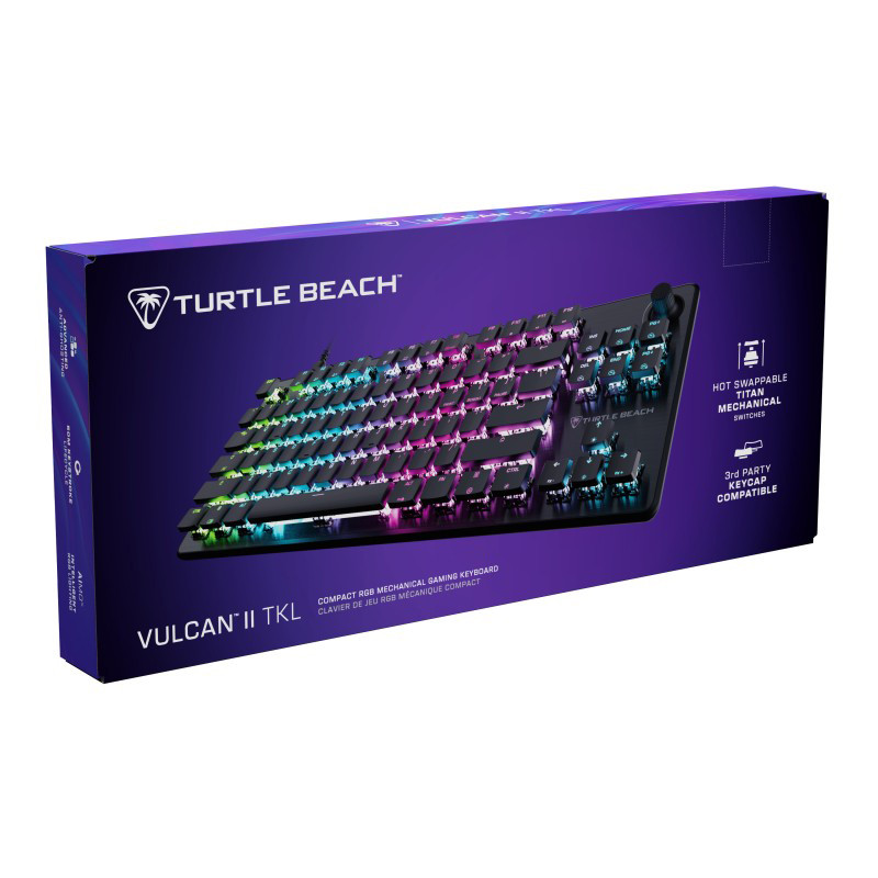 The Turtle Beach Vulcan™ II TKL is a tenkeyless mechanical gaming keyboard that frees up desk space while packing premium gaming performance for the long haul. Featuring TITAN HS hot-swappable pre-lubed switches for easy maintenance, sound dampening foam, and a brushed aluminum top plate, it delivers quiet, precise control. Personalize every key cap to your liking and customize every key with per-key RGB lighting and synched AIMO™ lighting via Swarm™ II while gaming confidently with ReacTap™ SOCD, advanced anti-ghosting and EASY-SHIFT[+]™. The left-side located detachable USB-C cable and onboard profiles make it a keyboard built for the long haul.