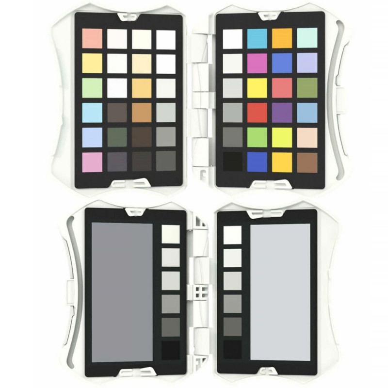 Four interchangeable color cards with 62 color targets, including expanded skin tone and grayscale references