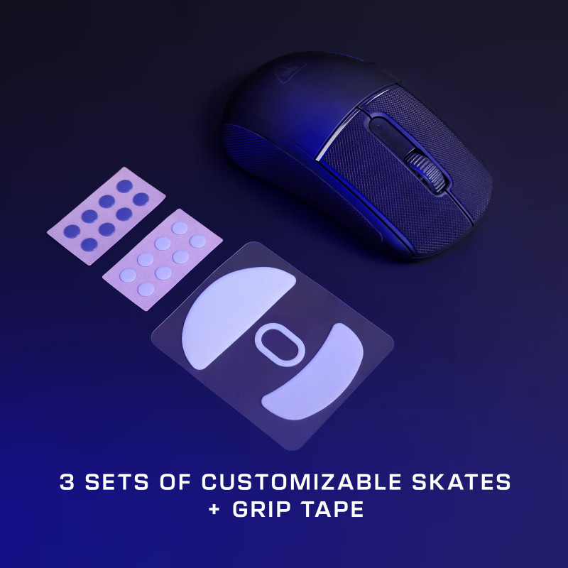 Personalize your feel with low friction pure PTFE skates, 8 dot dome PTFE skates and 8 dot UHMW-PE durable skates for glass mouse pads. Plus, grip tape is included for an even more customized fit and feel.