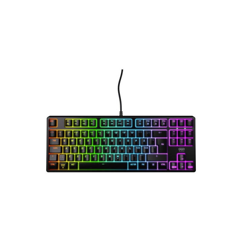 "CHERRY XTRFY K4V2 RGB TKL. Tastatur Formfaktor: Tenkeyless (80 - 87 %). Tastatur-Stil: Gerade. Übertragungstechnik: Kabelgebunden, Geräteschnittstelle: USB, Tastatur-Switch: Mechanischer Switch, Tastaturaufbau: QWERTY. Typ der Hintergrundbeleuchtung: RGB-LED. Kabellänge: 2 m. Empfohlene Nutzung: Gaming. Produktfarbe: Schwarz"