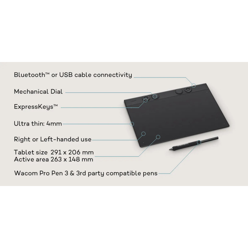 Designed for artists who need versatility, the Wacom Intuos Pro Medium delivers a seamless creative flow. With a 291 × 206 mm body and a generous 263 × 148 mm active area, it offers precision without sacrificing mobility. Equipped with the Wacom Pro Pen 3, customizable ExpressKeys, and wireless connectivity, it’s built for efficiency, comfort, and fluid creativity.