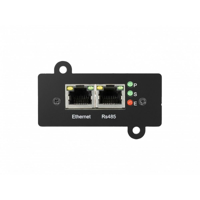 - Modbus RTU (485): The card can operate as Poll (master), allowing it to query up to 8 external sensors/devices, or as Slave, providing UPS parameters to PLC controllers. Modes are switchable but mutually exclusive.