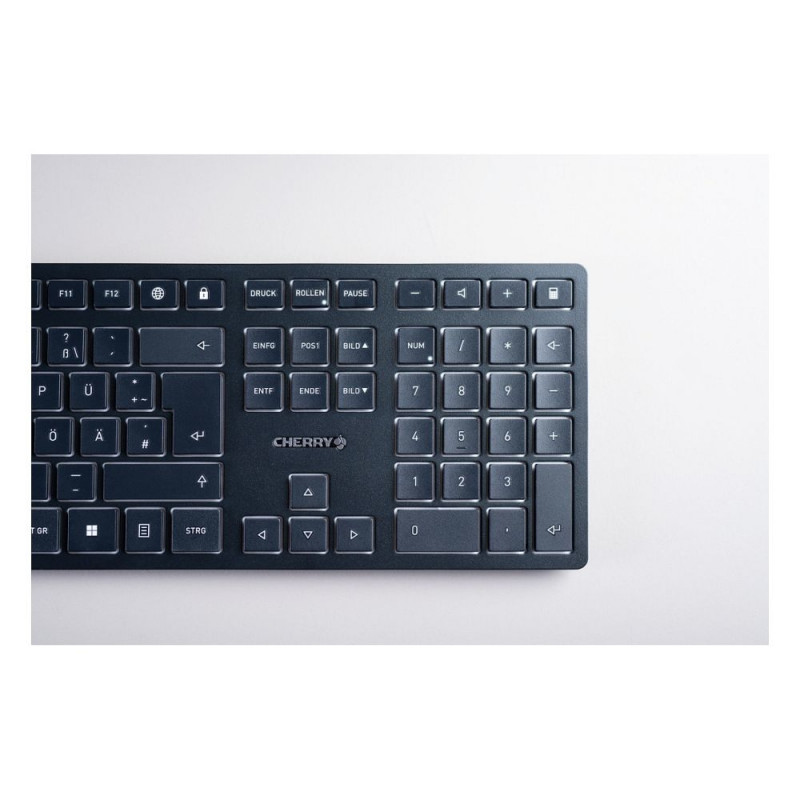 "CHERRY KW 9100 SLIM. Tastatur-Stil: Gerade. Übertragungstechnik: Kabellos, Geräteschnittstelle: RF Wireless + Bluetooth, Tastaturaufbau: QWERTZ, Tastatur - Tastenanzahl: 108. Kabellänge: 1,2 m. Empfohlene Nutzung: Universal. Produktfarbe: Schwarz"