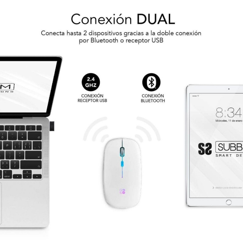 The SUBMO-LDFLAT2 wireless Bluetooth mouse from Subblim is a versatile device designed for users who need efficient equipment both in the office and at home. This mouse features dual connectivity combining low-energy Bluetooth 5.1 technology and a USB Type-A receiver, allowing simultaneous connection of up to two devices and easy switching between them. Its laser optical sensor offers an adjustable resolution of up to 1600 DPI with three customizable modes, ensuring smooth and precise tracking on multiple surfaces. Ergonomics are carefully considered with an ambidextrous design and rubber grips for comfortable handling during long sessions, plus it includes a built-in power on/off switch to optimize energy use. It also stands out for its silent click system (Silent Click) and a metal scroll wheel with a non-slip touch for a pleasant and discreet user experience. The LED lighting in seven colors (blue, cyan, green, purple, red, white, and yellow) adds a dynamic aesthetic touch that changes randomly, suitable for low-light environments or simply to personalize the workspace. Its integrated 500 mAh rechargeable lithium battery allows uninterrupted use thanks to charging via a Micro USB Type-B port, and it features an auto-off function after inactivity periods to maximize battery life. With a wireless range of 10 meters, it is a practical and comfortable solution for those needing reliable mobility and connectivity. It also supports multiple operating systems, including Windows (XP to 11), macOS, Android, iOS 13 and later, and ChromeOS, broadening compatibility for various setups. Its light weight (69 grams) and compact dimensions (112 mm long, 58 mm wide, and 20 mm high) add to its portability and ease of transport, while the package includes a mini USB receiver and user manual. Altogether, the SUBMO-LDFLAT2 packs all the technical features needed for a modern, multifunctional mouse, combining comfort, precision, and energy efficiency in a contemporary, functional design. This model represents a balanced and complete option for users who value dual technology, ergonomics, and efficiency in a wireless mouse.