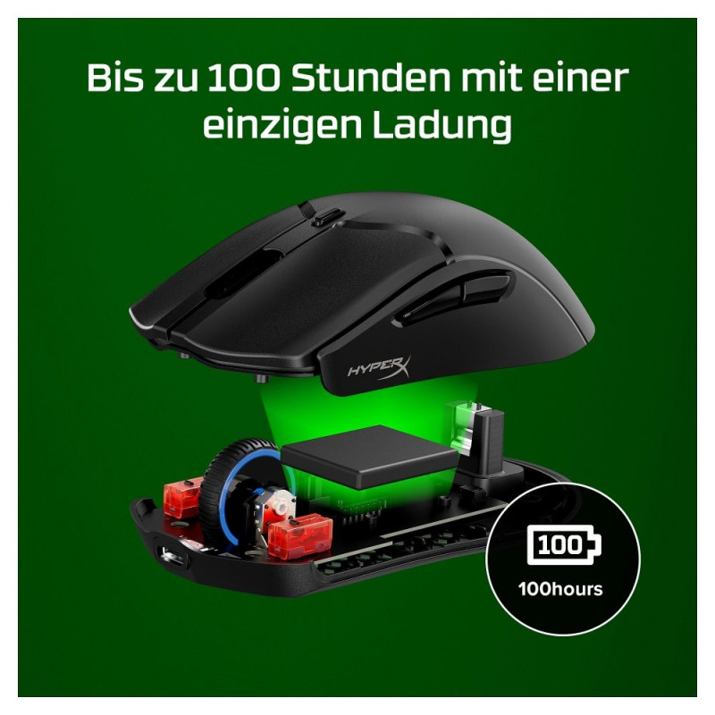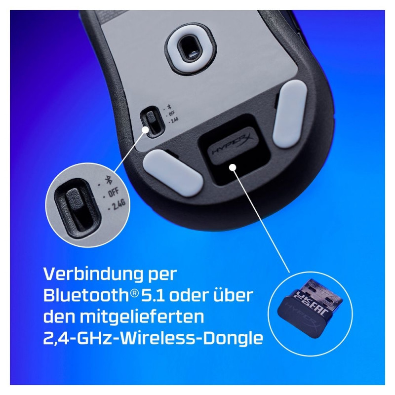 "HyperX Pulsefire Haste 2 – Wireless-Gaming-Maus (Schwarz). Formfaktor: Beidhändig. Bewegungerfassungs Technologie: Optisch, Geräteschnittstelle: RF Wireless + Bluetooth + USB Type-A, Bewegung Auflösung: 26000 DPI, Tastentyp: Gedrückte Tasten, Knopfanzahl: 6, Scroll Typ: Rad, Beschleunigung (Max.): 50 G. Farben der Beleuchtung: Multi. Energiequelle: Batterien / Kabel. Produktfarbe: Schwarz"