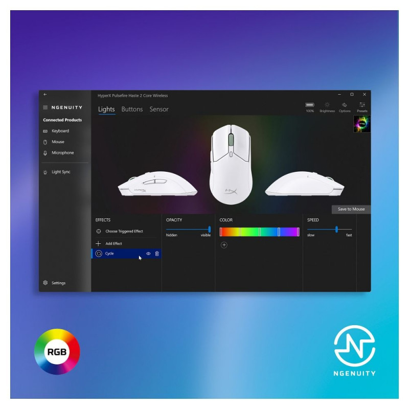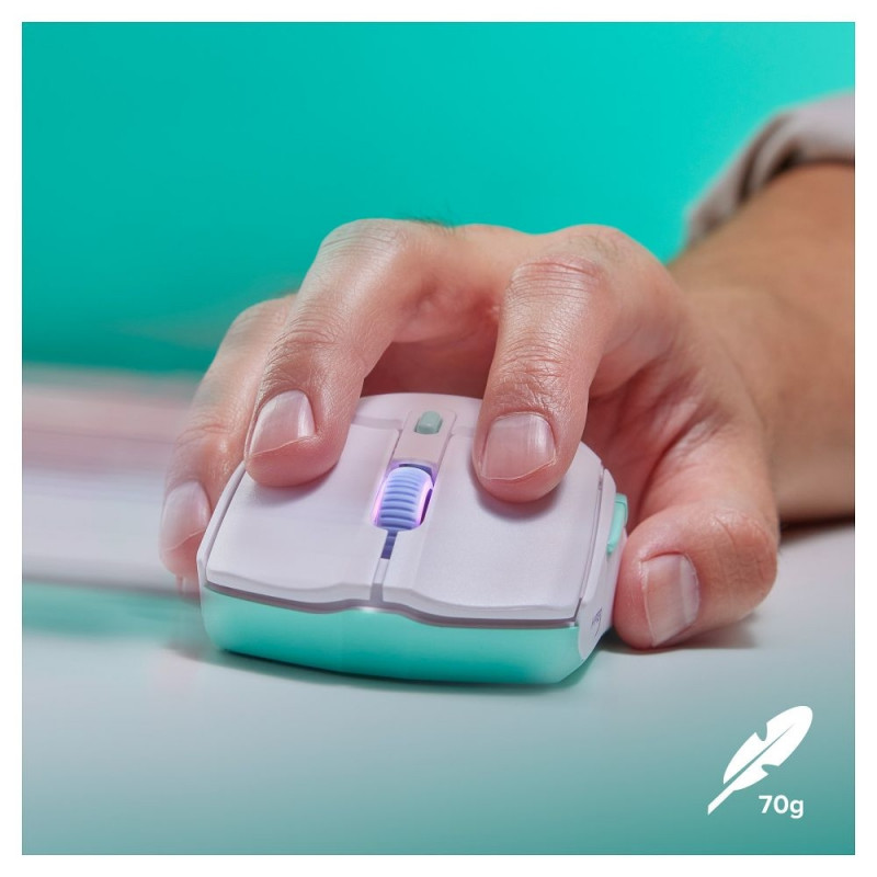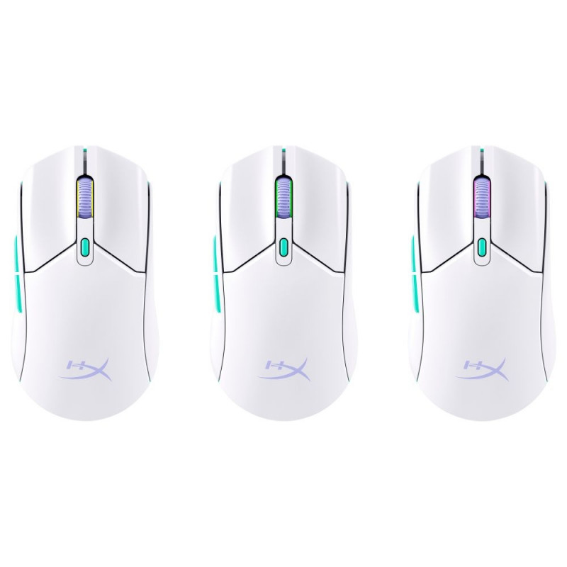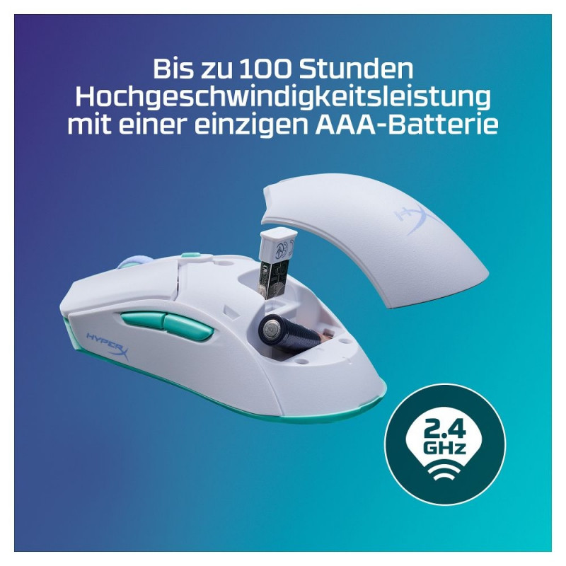 "HyperX Pulsefire Haste 2 Core WLS – Gaming-Maus (Weiß/Grün/Violett). Formfaktor: Beidhändig. Geräteschnittstelle: USB Typ-A, Bewegung Auflösung: 3600 DPI, Tastentyp: Gedrückte Tasten, Knopfanzahl: 6, Scroll Typ: Rad, Beschleunigung (Max.): 35 G. Energiequelle: Batterien. Produktfarbe: Weiß"