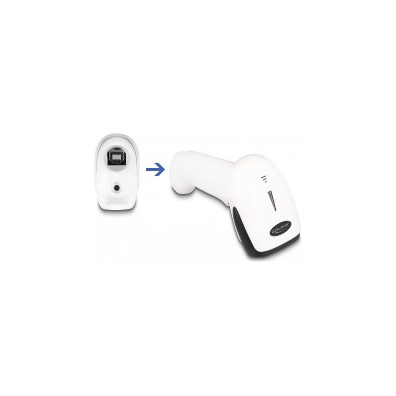"DeLOCK Barcode Scanner 1D und 2D für 2,4 GHz, Bluetooth oder USB - weiß. Typ: Tragbares Barcodelesegerät, Scanner-Typ: 1D/2D, Sensor-Typ: CMOS. Übertragungstechnik: Kabellos, Standard-Schnittstellen: Bluetooth, USB, Funkfrequenz: 2400 MHz. Produktfarbe: Weiß. Energiequelle: Akku, Akku-/Batteriekapazität: 1800 mAh, Eingangsspannung: 5 V. Gewicht: 190 g, Breite: 90 mm, Tiefe: 170 mm"