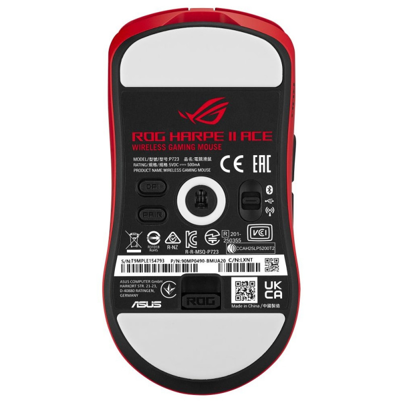 "ASUS ROG Harpe II Ace RED. Formfaktor: rechts. Bewegungerfassungs Technologie: Optisch, Geräteschnittstelle: RF Wireless + Bluetooth + USB Type-A, Bewegung Auflösung: 42000 DPI, Tastentyp: Gedrückte Tasten, Knopfanzahl: 5, Scroll Typ: Rad, Beschleunigung (Max.): 50 G. Energiequelle: Batterien / Kabel. Produktfarbe: Rot"