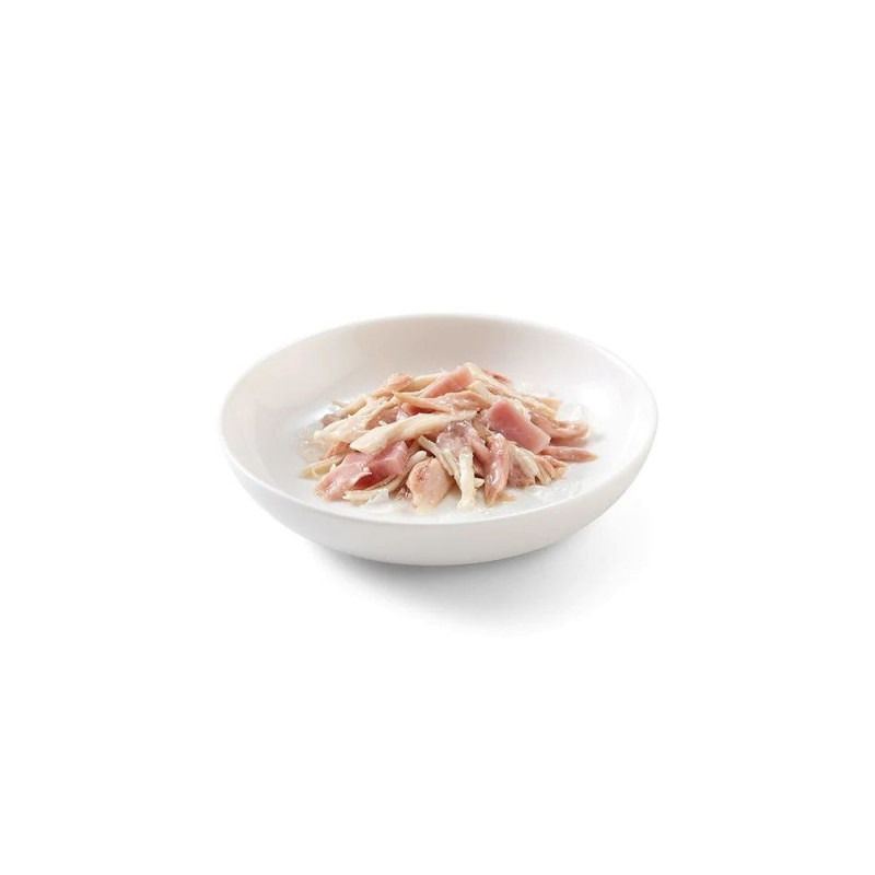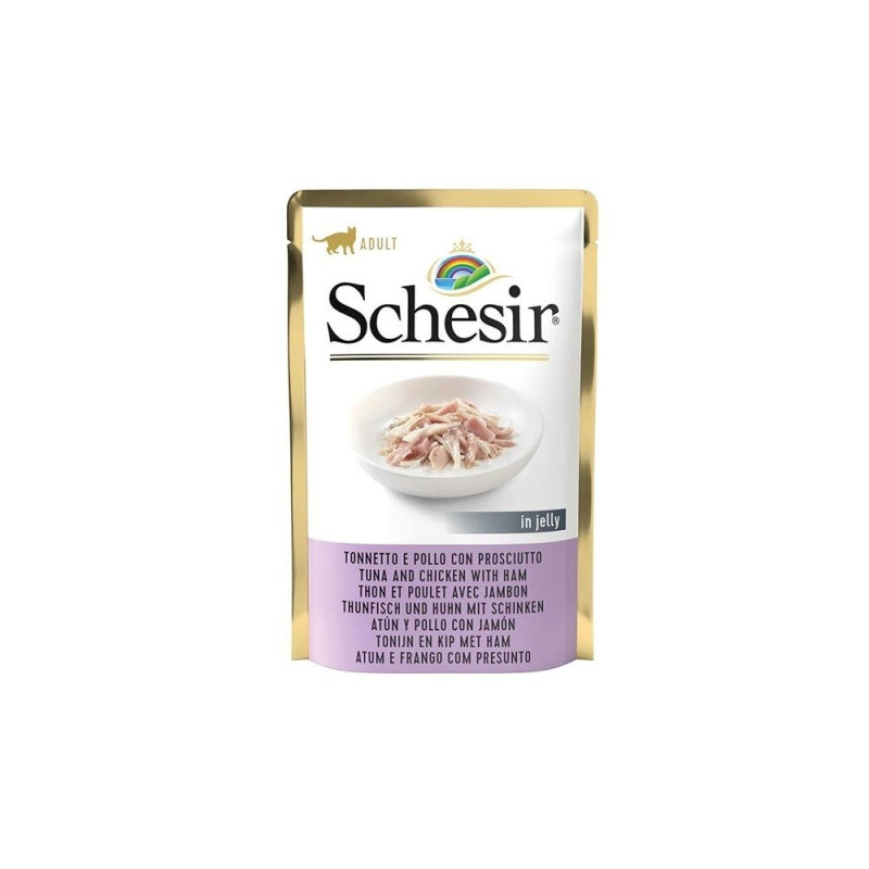 Schesir Jelly Tuna is a wet cat food made from high-quality fish-based ingredients, providing essential nutrients for adult cats. The product contains tuna and chicken with ham as the main flavor.