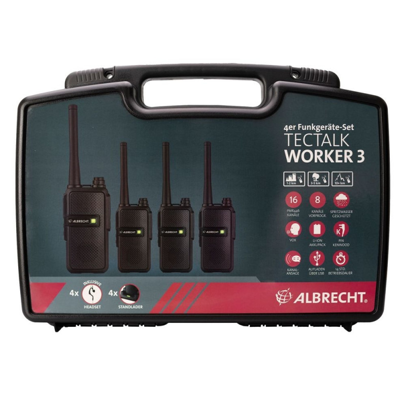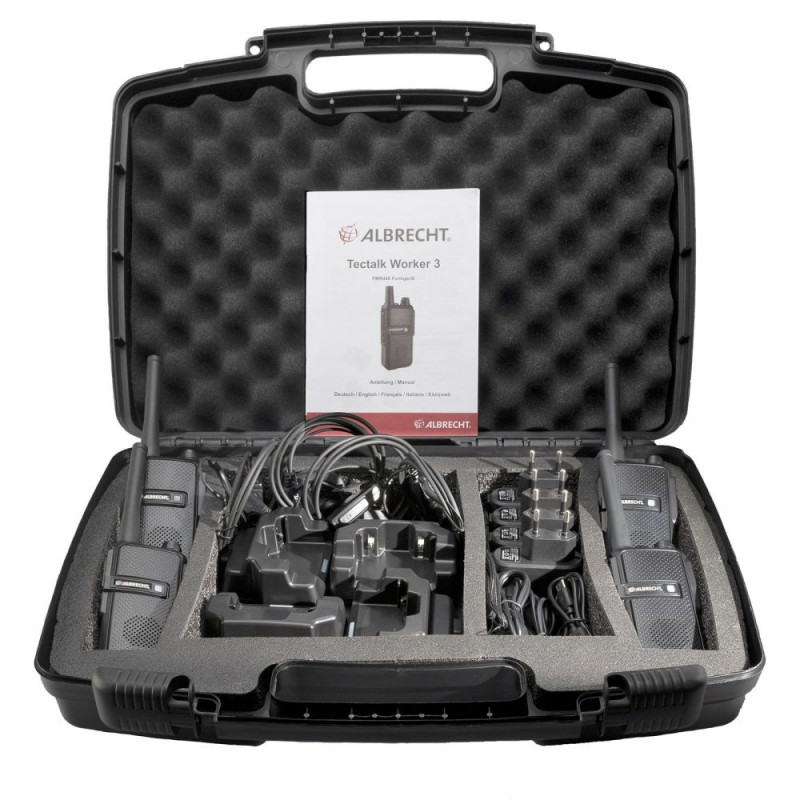Scope of delivery: 4x Tectalk Worker 3 radios, 4x headset, 4x stand charger + power supply, 4x battery 2200mAh, 4x belt clip, 4x hand straps, 1x carrying case, 1x manual