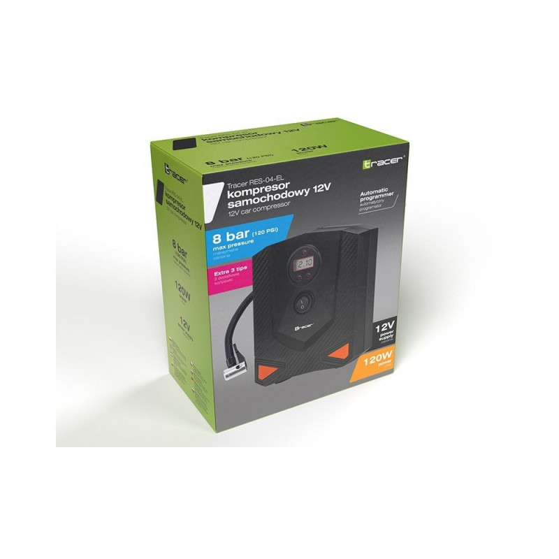 Powered by 12V and boasting 120W of power, the TRACER RES-04-EL compressor ensures quick and effective tire inflation in your car. With a maximum pressure of 8 bar and a 17 mm metal cylinder, it's ready for any road challenge.