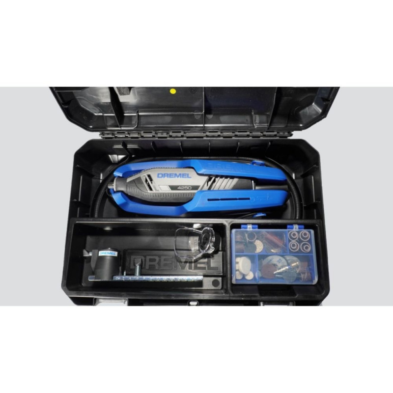 The Dremel 4250 is a high-performance, wired multi-tool with an extensive 45-piece accessory set in a sturdy carrying case.