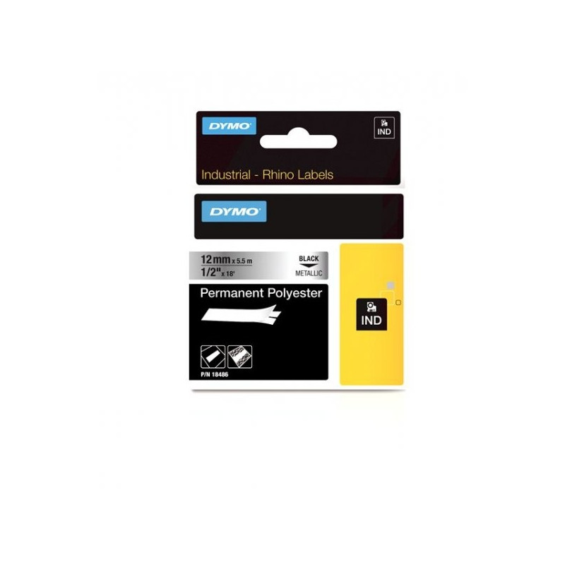 DYMO 18486 RHINO Poliesterio Juostelė 12mm x 5,5m (metalizuota / juodas šifras)