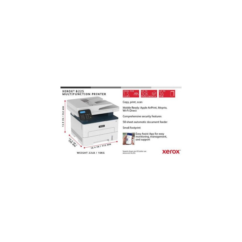 The Xerox B225 multifunction printer includes built-in Wifi with Wi-Fi Direct and is easy to set up with Xerox® Smart Start Software, so it is ready to work hard right out of the box. Print from your mobile devices with support for Apple AirPrint, Mo