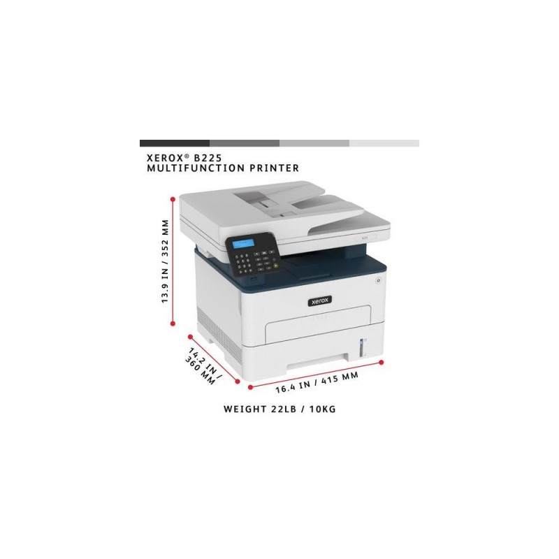 The Xerox B225 multifunction printer includes built-in Wifi with Wi-Fi Direct and is easy to set up with Xerox® Smart Start Software, so it is ready to work hard right out of the box. Print from your mobile devices with support for Apple AirPrint, Mopria Print Service and Chromebook printing. Designed for small businesses that need to print, copy, and scan. It includes features such as automatic 2-sided printing on letter and legal sized paper, a 50-sheet automatic document feeder, standard paper capacity of 250 sheets, a 1 GHz dual core processor with 512 MB of memory, and monthly print volume up to 2,500 pages, the B225 is a workhorse. Do more with optional Xerox Workflow Central, allowing you to convert documents into other languages, change handwriten messages into shareable text documents, create audio files of hardcopy to listen to on the go, automatically redact content, and convert scans into Microsoft Office Applications. And our Green World Alliance program offers hassle-free toner cartridge recycling.<br><br>Xerox B225 A4 34ppm Wireless Duplex Copy/Print/Scan PS3 PCL5e/6 ADF 2 Trays Total 251 Sheets. Print technology: Laser, Printing: Mono printing, Maximum resolution: 1200 x 1200 DPI. Copying: Mono copying, Maximum copy resolution: 600 x 600 DPI. Scanning: Colour scanning, Optical scanning resolution: 1200 x 1200 DPI. Duplex functions: Copy, Print. Maximum ISO A-series paper size: A4. Wi-Fi. Direct printing. Product colour: Blue, White
