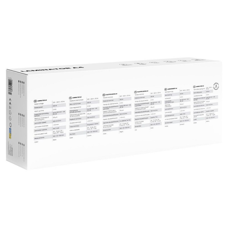 | Other features | Rated Voltage: 220-240 V~, 50 Hz Rated Power: 300 W Warm-up Time: approx. 2 min Maximum Lamination Pouch Thickness: 125 m Maximum Lamination Thickness: 0.5 mm Lamination Modes: Hot/Cold |