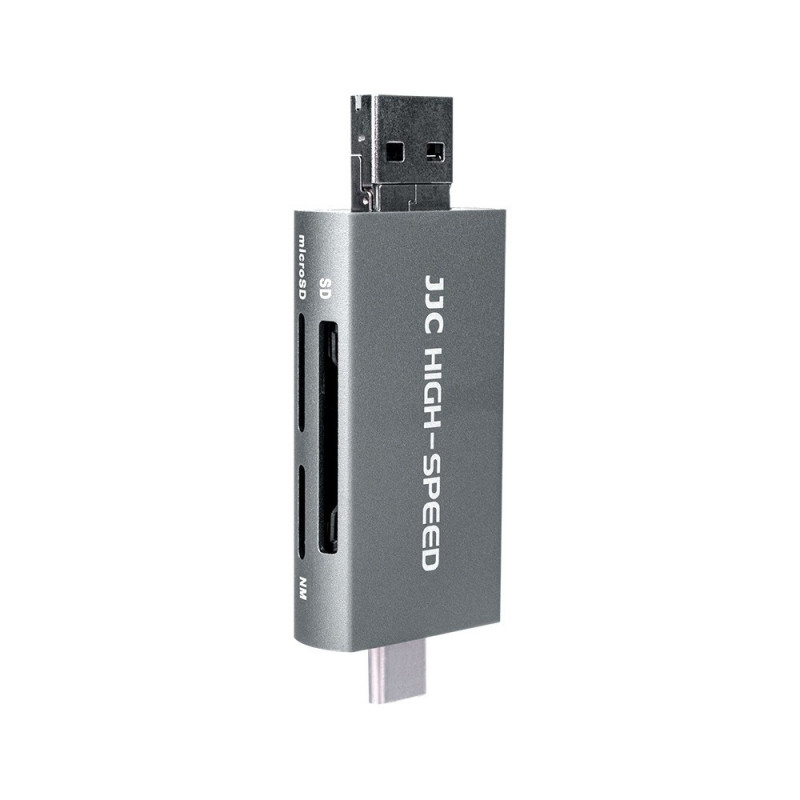 The JJC CR UTC5AC USB 3.0 Card Reader features 3 ports: USB 3.0 Type A port, USB 2.0 Micro B port and USB 3.0 Type C port, expands 3 card slots (SD/Micro SD/NM) to your computers, Micro OTG/ USB C OTG enabled phones or tablets. It is a convenient method to transfer files/photos/videos between the camera's SD cards and your phones/ tablets/ computers or between dual memory cards.