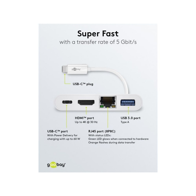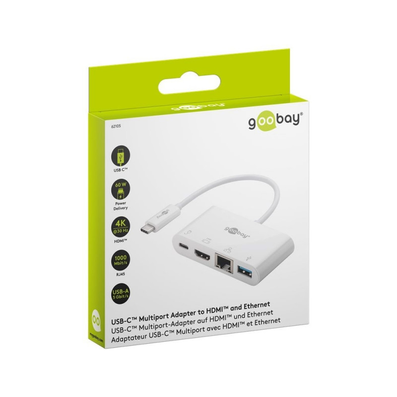 The Multiport Adapter routes signals from USB-C™ to HDMI™, Ethernet and USB devices. Super-fast network connection via built-in Ethernet port (Gigabit) with a transfer rate of 5 Gbit/s Additionally with USB A 3.0 socket for fast data transfer and charging. USB Power Delivery technology enables charging of end devices with a voltage of up to 60 W. Thus, for example, large notebooks, hubs or docking stations can be charged without problems. Resolutions up to 4K x 2k @ 30 Hz are supported.