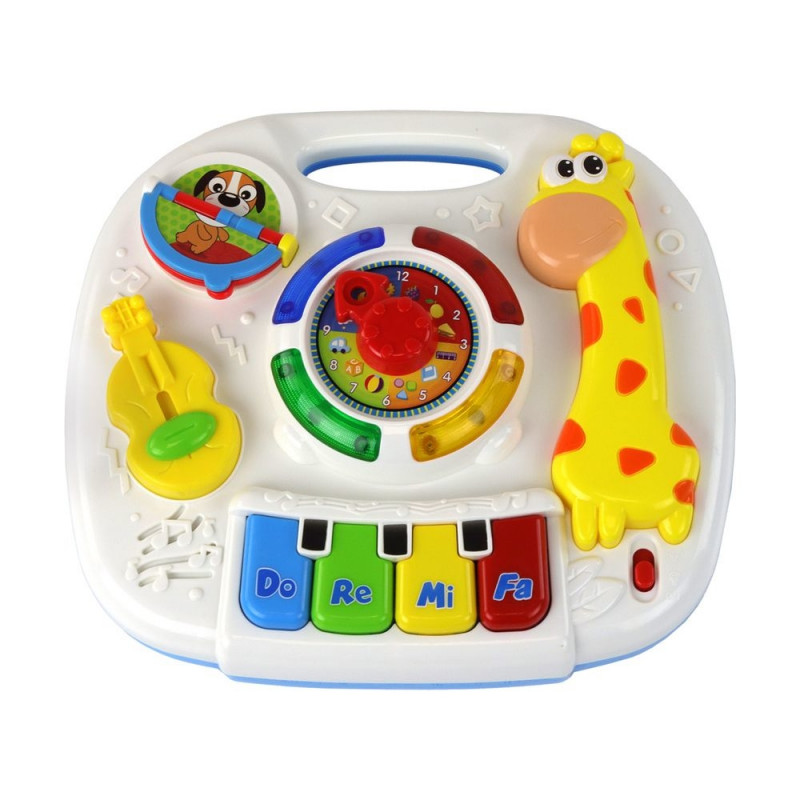 Stolik edukacyjny posiada także wiele innych elementów, które pobudzają zmysły i rozwijają zdolności poznawcze. Małe pianinko zachęca do eksploracji dźwięków, żółta żyrafa i gitara rozwijają zainteresowanie instrumentami muzycznymi, a malutka książeczka z przewracanymi stronami pomaga w poznawaniu zwierzątek.