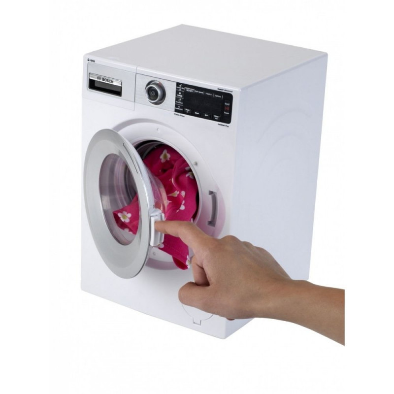 Zabawkowa pralka na baterie z funkcjami odpowiednimi dla dzieci jest wierna oryginalnej replice z wyświetlaczem zaprojektowanym przez firmę Bosch. Ma możliwość napełniania i odprowadzania wody, działa z wodą i bez wody oraz ma cztery różne oryginalne dźwięki, które pasują do programów.
