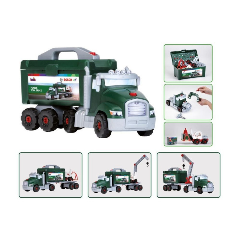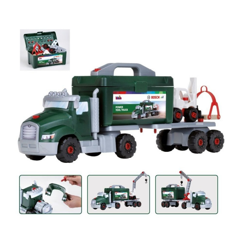 Ciężarówka pochodzi z serii zabawek Bosch mini powstałej na licencji firmy Bosch, dlatego też narzędzia wchodzące w jego skład są wiernymi kopiami faktycznie istniejących narzędzi tej marki. Ciężarówka zapewni mnóstwo świetnej zabawy. Pojazd może składać i rozmontowywać do woli, a wszystko to dzięki dołączonemu do zestawu ręcznemu śrubokrętowi. Zestaw składa się z 86 części i umożliwia stworzenie wielu pojazdów, dzięki czemu zabawa nie będzie miała końca. Pojazd ciężarowy wyposażony został w zdejmowaną skrzynkę na narzędzia, więc dojazd do miejsca, gdzie potrzebna jest naprawa będzie niezwykle prosty. Duża ciężarówka od firmy Klein to świetny pomysł na prezent dla chłopców, którzy lubią zabawę w majsterkowanie. Pojazd ma aż 47 centymetrów długości z możliwością rozbudowy, aż do 70 centymetrów. Samochód ma kompletnie załadowaną skrzynię narzędziową, w której znajduje się wszystko, co jest niezbędne do dobrej zabawy. Zawarte w zestawie narzędzia pozwolą maluchom zmienić tą ciężarówkę w duży transporter, który może pomieścić dźwig, wózek widłowy i paletę. Zabawka wykonana jest z wysokiej jakości tworzywa sztucznego, dzięki czemu jest w pełni bezpieczna dla najmłodszych dzieci. Dbałość o szczegóły i solidne wykonanie auta sprawią, że będzie ono dzieciom służyć przez długi czas. Podczas zabawy dzieci rozwijają kreatywność a także ćwiczą zręczność i motorykę.