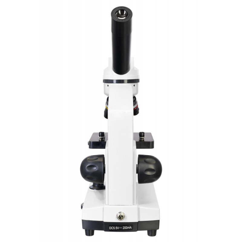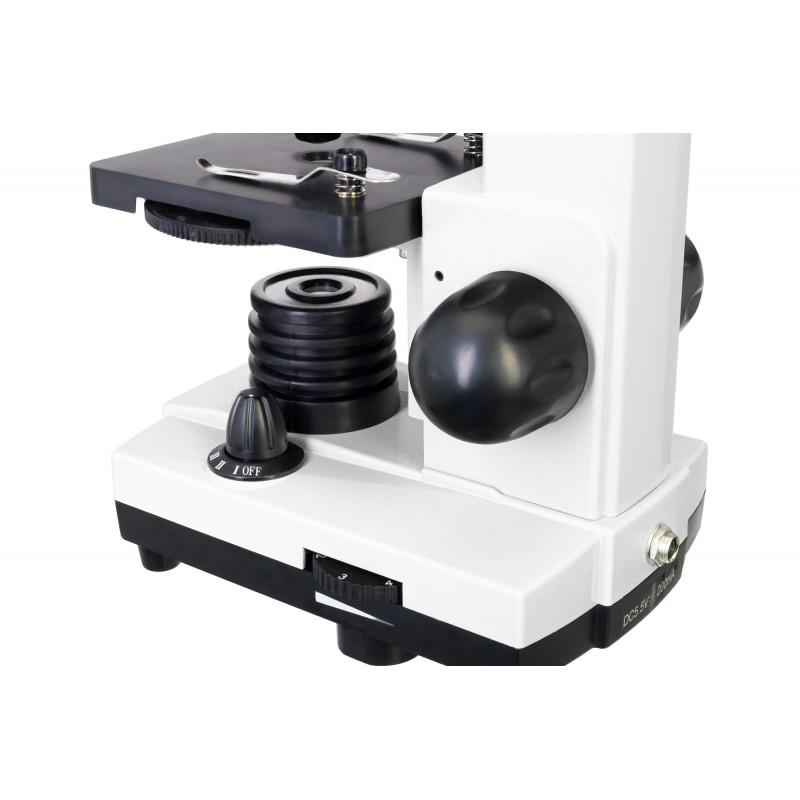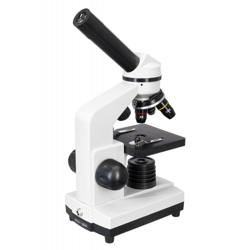 The microscope’s body is made of plastic, so while being quite sturdy it weighs a lot less than a metal one, which makes the microscope easily transportable. For additional comfort during observations, the microscope’s head is inclined at 45°. The device can be powered by an electrical outlet (convenient at home and at school) or by batteries (great for outdoor observations).