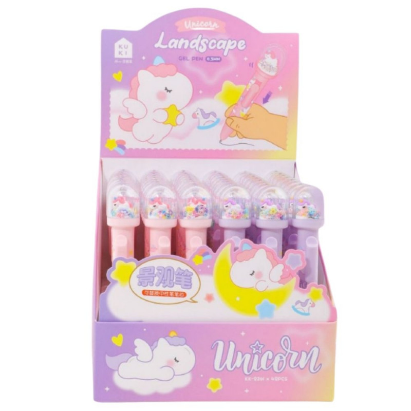 Uroczy długopis z figurką i ruchomym brokatem to idealny dodatek do szkolnego zestawu dla dzieci i młodzieży. Pastelowe kolory, bajkowe motywy oraz przezroczysta kopułka z ruchomymi elementami sprawiają, że pisanie staje się jeszcze przyjemniejsze. Długopis wyróżnia się unikalnym designem ? w przezroczystej nasadce umieszczona jest figurka w otoczeniu pływających gwiazdek, brokatu i innych dekoracyjnych drobinek.