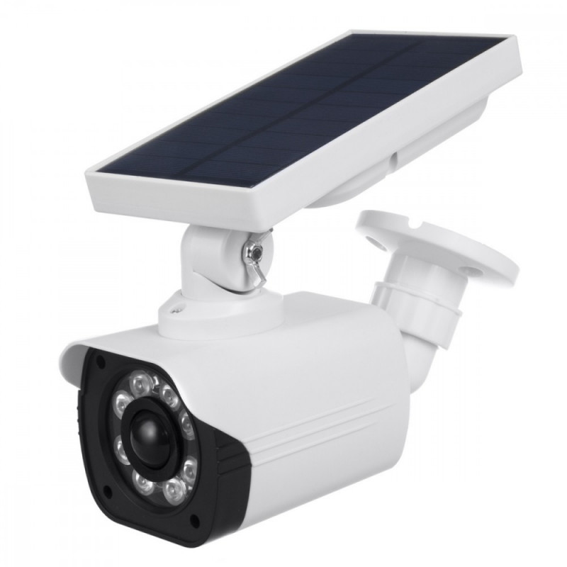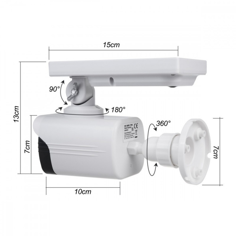 | Other features | Practical dummy security camera with solar panel 3 lighting modes and motion detector PIR motion sensor with 120° coverage angle and adjustable range of 6 to 8 m LED lighting with 5W and 800lm luminous flux Solar power supply - energy-efficient and practi |