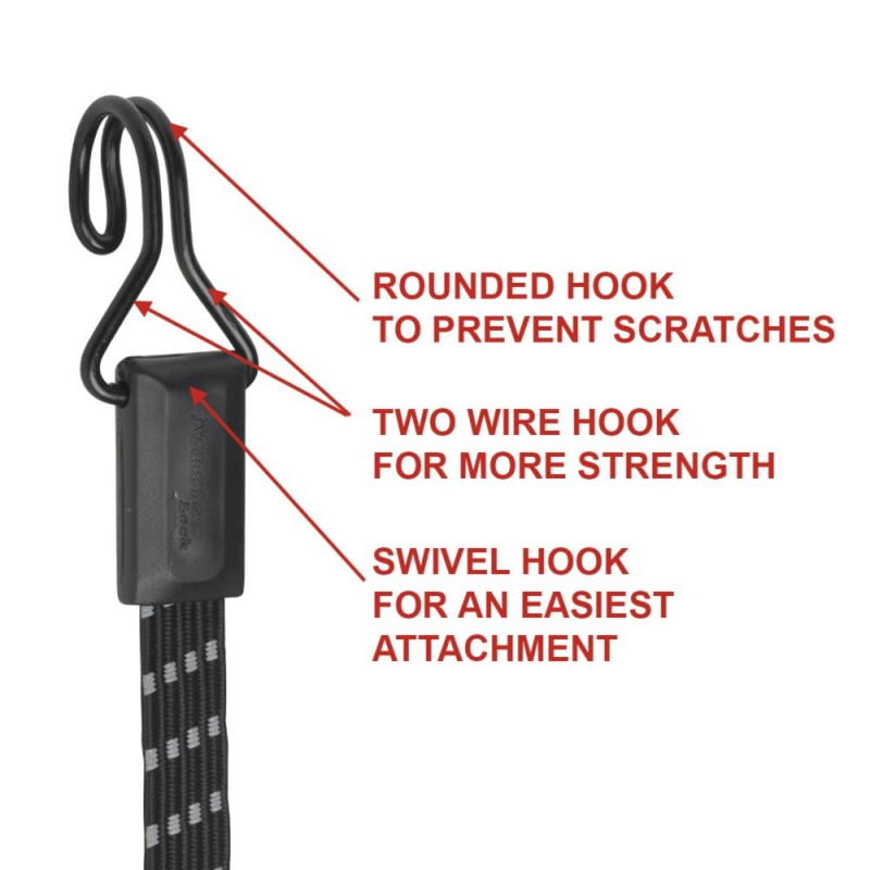 - Two wire hooks offer higher robustness than conventional rubber tensioning ropes