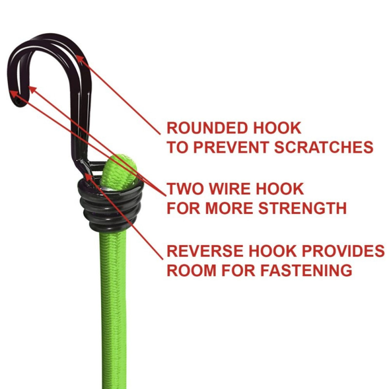 - Two wire hook offers more strength than traditional bungees