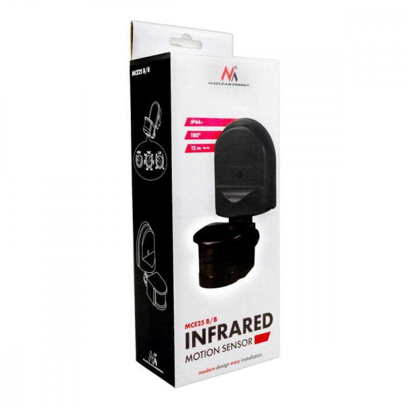 180° PIR motion sensor functional lighting control The Maclean MCE25 motion sensor is a practical solution for automatic lighting control in indoor and outdoor spaces. With a detection angle of 180° and an adjustable detection range of 5 to 12 meters, the device allows you to precisely adjust the operating area to the size of the monitored space. The adjustable, rotating sensor head allows for precise adjustment of the motion detection field, which increases effectiveness and reduces unwanted activations. The IP44-rated housing protects the sensor from water splashes and foreign objects, making it ideal for indoor use and locations such as covered terraces, carports, and entrance areas. The aesthetic, discreet design makes the sensor a good fit for various types of interiors.