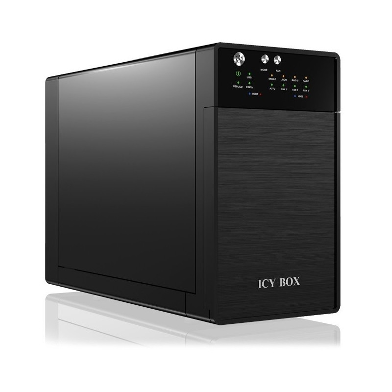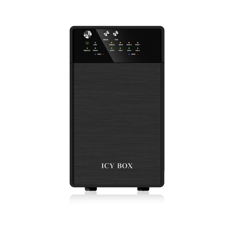 Thanks to the variable speed fan, the IB-RD 3620 is quiet and always provides the optimum operating temperature. The device has a synchronized standby mode that helps protect the environment and save energy. Supported RAID modes are JBOD, BIG, RAID 0 (Striping) and RAID 1 (Mirroring).