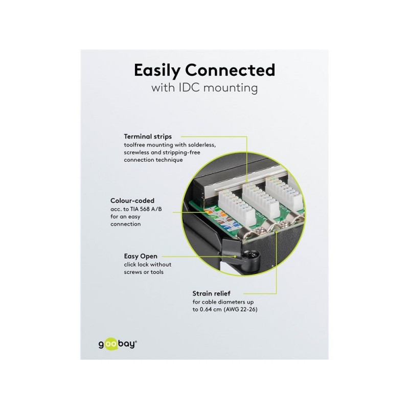 | Description | Our patch panels have a robust metal housing with shielded slots for an excellent connection. Simply select a panel with 8, 12 or 24 ports to easily connect all your Ethernet cables to the network patch panel. Goobay always provides the perfect products f |
