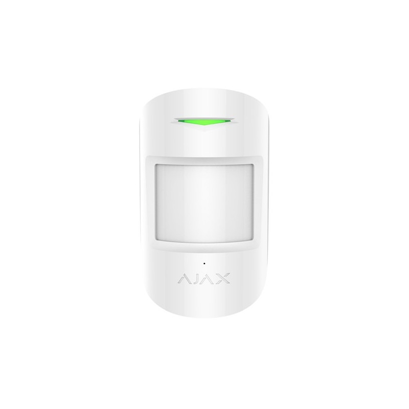 Pet immune combined motion and glass break detector. Ajax CombiProtect detects the first step of a human intruder on the premises but ignores the motion of pets, drafts and air conditioners. Protects windows up to 9 meters from the detector.  Maximum performance Works up to 1,200 meters from Ajax Hub in open space or across several floors of a business center. Detects motion up to 12 meters away. Detects broken glass up to 9 meters away. Detects the first step of an intruder. Processes signals digitally.  Protection from intruders and failure Uses authentication to protect against fraud. Tamper-resistant body. Response from detectors can be checked every 12-300 seconds (adjustable). Detects jamming, encrypts communication channels, and ensures authentication.  Effortless operation Adjustable to three different sensitivity levels. Uses our SmartDetect algorithm to avoid false alarms from animals weighing less than 20kg. Eliminates false alarms from gear and electromagnetic interference using a FresnelTech optical component, made from POLY IR4 material and an Excelitas PIR sensor. Works under most conditions due to digital temperature compensation. Uses two-factor detection of broken glass at low and high frequencies to prevent false alarms. Two-way communication with Ajax Hub allows for periodic testing and customization. Has a battery life of up to 5 years.  Simple professional-level installation No need to disassemble the body when installing using SmartBracket mounts. The quality of the connection and detection area can be tested remotely. Connects to Ajax Hub with a single click. Can be used with third-party security systems using the uartBridge and ocBridge Plus modules.  Technical specification Detector type: Wireless Use: Indoor Movement detection distance: Up to 12 m (39.4 ft) Movement and glassbreak sensitivity: 3 levels adjustable (low, medium, high) Movement detection angle: 88.5° horizontal / 80° vertical Installation height suggested: 2.4 m (7.9 ft) Pet ignoring option: Weight up to 20 kg (44 lb), height up to 50 cm (19.7 in) Glassbreak detection distance: Up to 9 m (29.5 ft) Detecting element: Pyrosensor (movement), electret microphone (glass break) Tamper protection: Available Radio signal power: 20 mW Communication protocol: Jeweller (868.0-868.6 MHz) Maximum distance between detector and central unit: Up to 1,200 m (6,552 ft) (in open area) Power supply: CR123A battery Power supply voltage: 3 V Battery life: Up to 5 years Operating temperature range: From 0°C (+32°F) to +50°C (+122°F) Operating humidity: Up to 80% Dimensions: 110x65x50 mm (4.33x2.55x1.96 in)  Components Combined motion and glass break detector CR123A battery (pre-installed) Installation set Manual