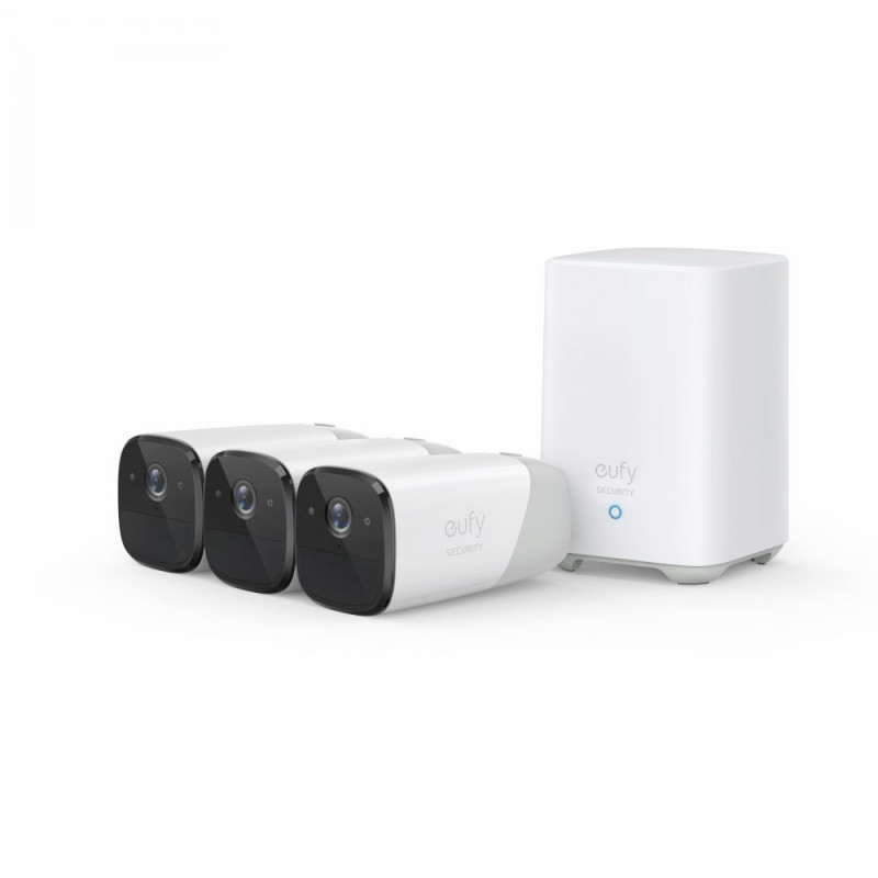 "Eufy eufyCam 2 Pro 3-Cam Kit. Typ: IP-Sicherheitskamera, Unterstützte Positionierung: Innen & Außen, Übertragungstechnik: Verkabelt & Kabellos. Befestigungstyp: Wand, Produktfarbe: Weiß, Formfaktor: Patrone (Form). Blickwinkel (FOV): 140°. Größe des Bildsensors: 25,4 / 2,7 mm (1 / 2.7""). Digitaler Zoom: 8x"